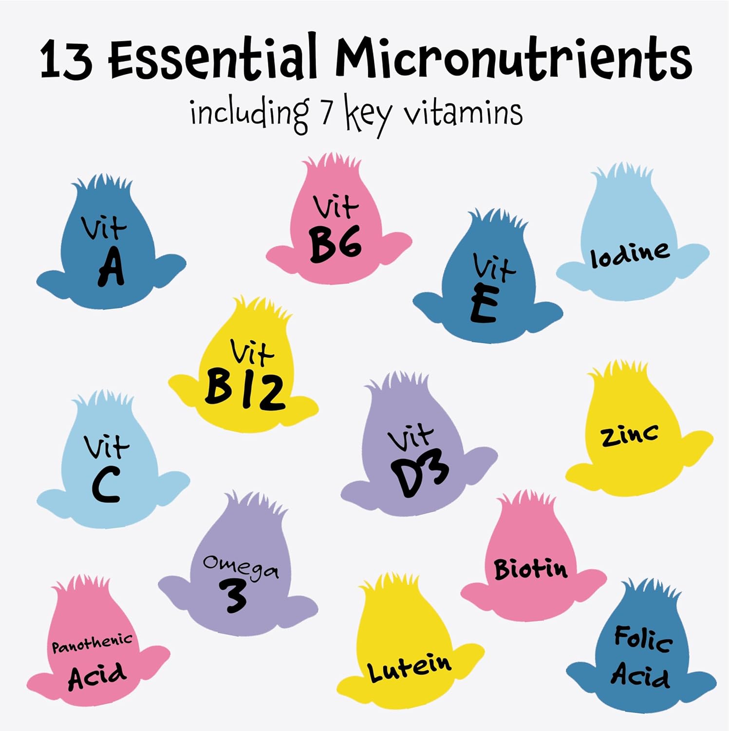 Nutriburst Trolls Superkidz - Chewable Multivitamin For Health, Growth & Development - 13 Essential Nutrients: Vitamin A, B12 C, D3, E, Iron, Omega-3 - Vegan + Sugar Free - Orange Flavour - 60 Gummies