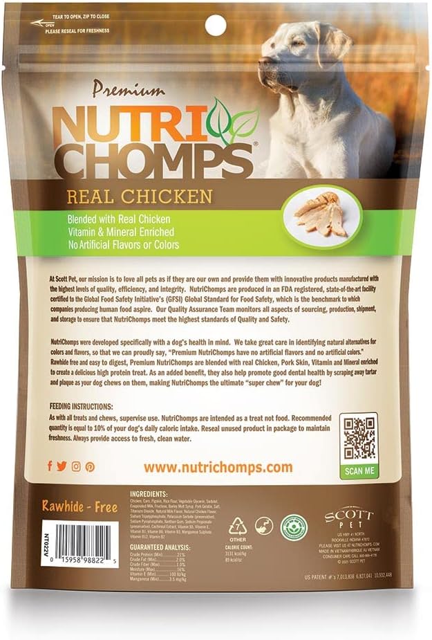 You Pay Close Attention To The Ingredients In Your Favorite Foods, So It Only Makes Sense To Do The Same For Every Member Of The Family – Including Your Fur Family! Made With Real Chicken And Pork Skin, Nutrichomps Are Sure To Become Your Dog’S Favorite Treat. They Are Fortified With Vitamins And Minerals, Making Them As Delicious As They Are Nutritious. Along With Yummy Protein From Chicken And Pork Skin, We Add Vitamin E To Help Boost Your Dog’S Circulatory System Health. Added Manganese Sulfate Assists With Nervous System Function, While Riboflavin Supplements Support Skin, Eyes, And Abdomen Health. Indulging In Dog Treats Has Never Been So Healthy For Your Pup.We Recommend That You Treat Your Dog To A Nutrichomps Chew To Alleviate Boredom, Reward Good Behavior Or Simply As An Everyday Treat. Not Only Do Our Chews Provide Plenty Of Entertainment But Also Help Improve Dental Hygiene. These Wholesome Chews Promote Good Dental Health By Helping To Remove Plaque And Tartar From Their Teeth And Gums As They Chew. Why 100% Rawhide Free Rawhide Chews For Dogs Are Only Partially Digestible Which Means The Remaining Product Can Create Potential Digestion Issues In Dogs. Because Nutrichomps Are 100% Rawhide-Free, They’Re Easy To Digest. Even The Pups With The Most Sensitive Of Stomachs Will Love These Dog Chomps. What Makes Your Dog Obsessed With Nutrichomps Oven-Roasted Chicken, Real Peanut Butter And Creamy Milk Are Flavors Pups Crave! Manufactured In A State-Of The-Art Facility That Has Been Certified By The Same Standards As Human Grade Food. Nutrichomps Facility Is One Of The Few Pet Manufacturing Facilities In The World To Receive Gfsi Certification. We Are Proud Of The Dedication, Hard Work And Commitment To Quality That Was Required To Earn This Elite, Quality Certification. Give Your Precious Pup The Tasty Reward They’Ve Been Barking For!