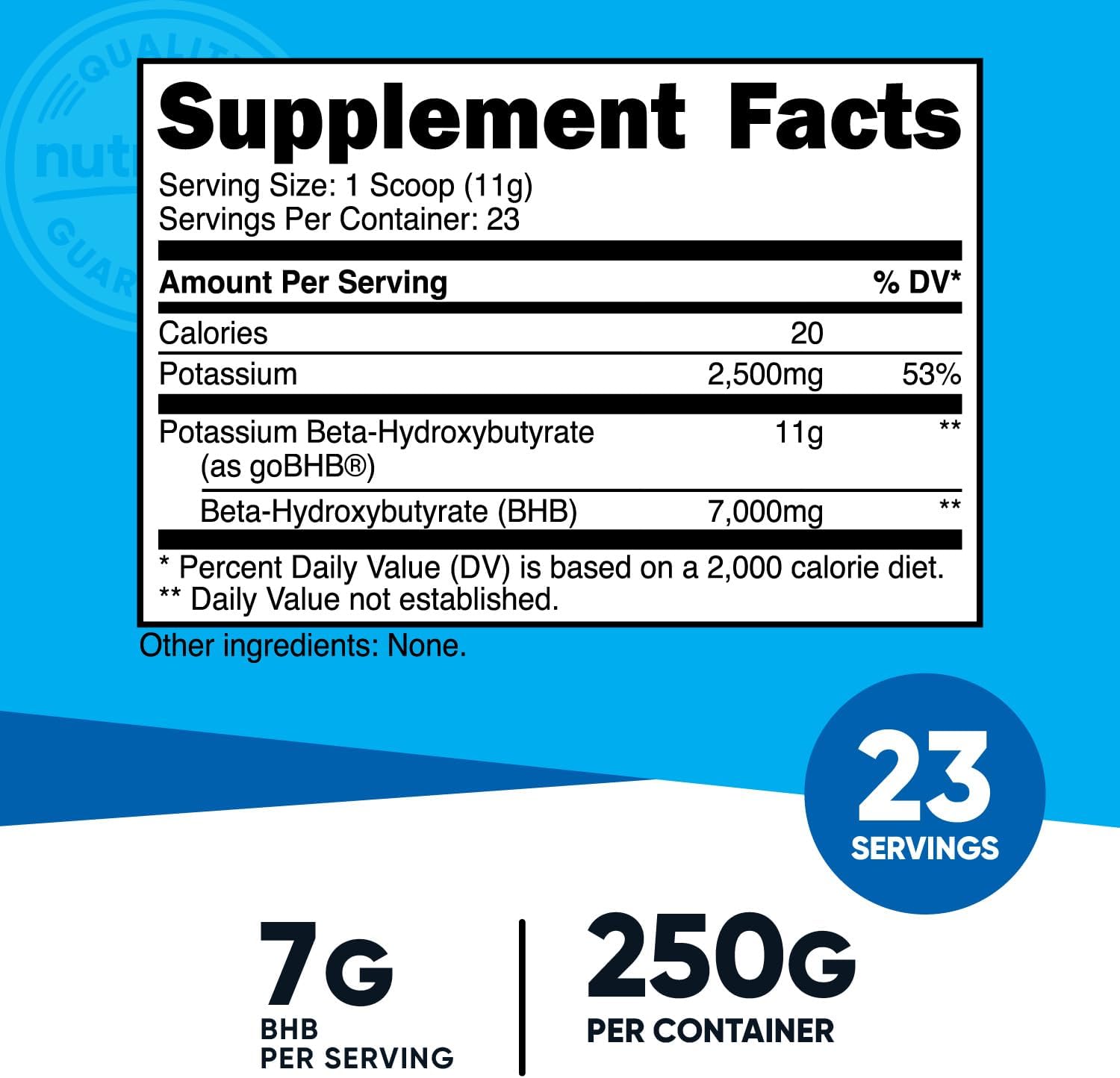 DESCRIPTION : Nutricost Potassium BHB Salts, Exogenous Ketone Supplement, 6.4g Beta-Hydroxybutyrate Per Serving, 250 Grams