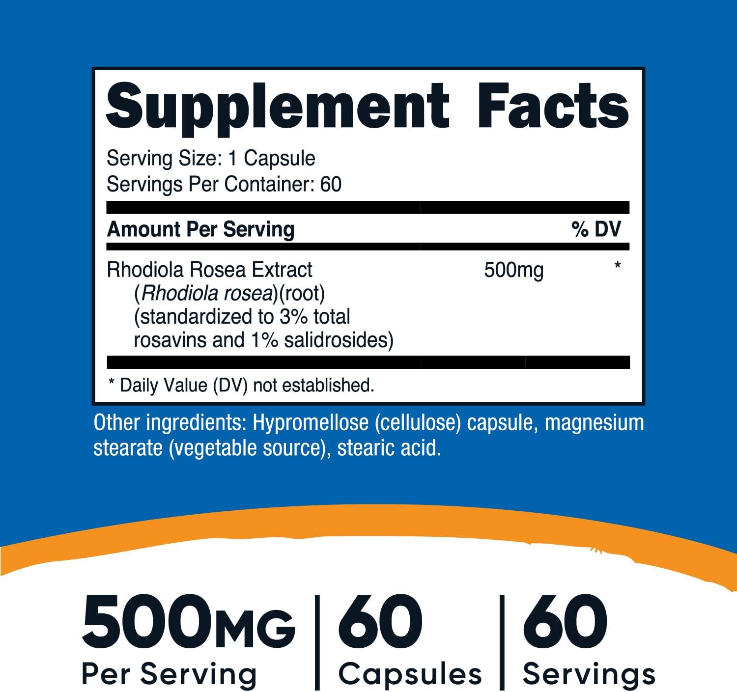 Nutricost'S Premium Rhodiola Rosea Extract Supplement Is Standardized To Produce The Most Beneficial Results. Each Vegetarian Capsule Contains 500Mg Of Rhodiola Rosea Extract And Each Bottle Contains 60 Capsules. They Are Non-Gmo, Gluten Free, And 3Rd Party Tested By Independent, Iso-Accredited Laboratories