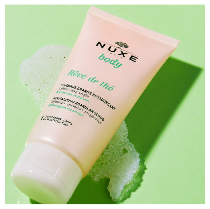 Nuxe Body Rêve De Thé Revitalising Granular Scrub 150Mlis An Ultra-Fresh Exfoliating Scrub That Smoothes And Invigorates The Skin. Formulated With Vegetable Exfoliants, This Exfoliating Scrub, An Ultra-Fresh Cocktail Of Green Tea Extract And Bamboo Seeds, Frees The Skin From Dead Cells To Leave It Rejuvenated And Vivified, Like New. Its Granular Texture And Irresistible Scent With Notes Of Green Tea, Rhubarb And Fresh Herbs Delight The Senses, To Give You A Refreshing Sensation Of Freshness. Released From Dead Cells, The Skin Is Rejuvenated And Like New. 96% Of The Ingredients Are Of Natural Origin. Vegan. Made In France