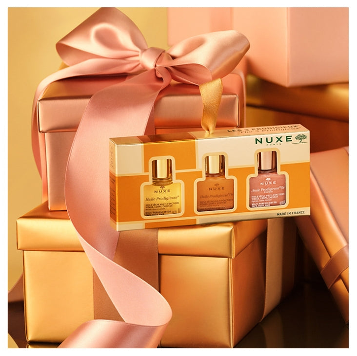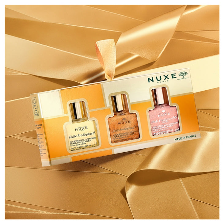 Nuxe Coffret Les 3 Prodigieux Combines 3 Iconic Huiles Prodigieuses In A Festive Gift Set. Each Contains 7 Precious 100% Plant Oils: Moisturizing Tsubaki Oil, Repairing Argan Oil, Nourishing Macadamia Oil, Smoothing Borage Oil, Moisturizing Camellia Oil, Protective Hazelnut Oil, Softening Sweet Almond Oil. - Nuxe Huile Prodigieuse Or Florale 10 Ml Is A Multi-Functional, Glittery Dry Oil Enriched With Golden And Rosy Pearls. In A Single Step, It Moisturizes, Silkens And Illuminates Face, Body And Hair. Skin And Hair Are Adorned With A Subtle Iridescent Rose-Gold Glow And A Delicate Floral Fragrance With Notes Of Grapefruit Zest, Magnolia And Musk. 96% Ingredients Of Natural Origin. Dermatologically Tested. Vegan. Made In France