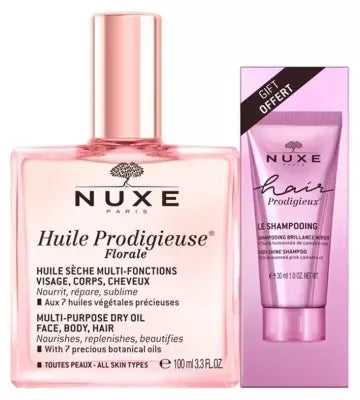 Nuxe Huile Prodigieuse Florale 100 Ml + Hair Prodigieux High Shine Shampoo 30 Ml Free Is A Duo Of Scented Body And Hair Care Products. - Nuxe Huile Prodigieuse Florale 100 Ml Nuxe Huile Prodigieuse Florale 100Ml Is A Multi-Function Dry Oil That Can Be Used For Facial, Body And Hair Care. It Nourishes, Repairs And Enhances. It Is Inspired By The Legendary Scent Of Prodigieuse Oil And Comes In A New Floral And Delicate Fragrance. This Dry Oil Is Formulated Based On Main Active Ingredients Of Natural Origin With 7 Precious 100% Vegetable Oils: Moisturizing Tsubaki Oil, Restorative Argan Oil, Nourishing Macadamia Oil, Smoothing Borage Oil, Moisturizing Camellia Oil, Protective Hazelnut Oil, Softening Sweet Almond Oil. Its Anti-Oxidant Action, Its "Anti-Pollution Shield" Effect And Its Effect On Reducing The Appearance Of Stretch Marks Make It A Daily Ally. Its Dry Oil Texture Is A Real Pleasure To Apply, It Reveals A Floral And Delicate Fragrance With Notes Of Grapefruit Zest, Magnolia And Musk. 97% Ingredients Of Natural Origin. - Nuxe Hair Prodigieux High Shine Shampoo 30 Ml Free Is A Treatment That Gently Washes, Nourishes Without Weighing Down, And Delicately Perfumes Hair To Leave It Sublimated. Its Formula Combines : Fermented Camellia Rose Oil: Thanks To Its Fermentation Process, It Has Enhanced Repairing And Nourishing Properties. A Cleansing Base Of Natural Origin: It Contains 4 Surfactants Of Natural Origin And Of Different Types To Combine Effective Cleansing With Good Tolerance. Its Milky Texture, With The Mythical Fragrance Of Huile Prodigieuse®, Envelops Hair For An Incredible Sensory Ritual. Hair Is Sublimely Radiant With An Addictive Silky Touch. 94% Of Ingredients Are Of Natural Origin. Sulfate- And Silicone-Free. Vegan. Made In France