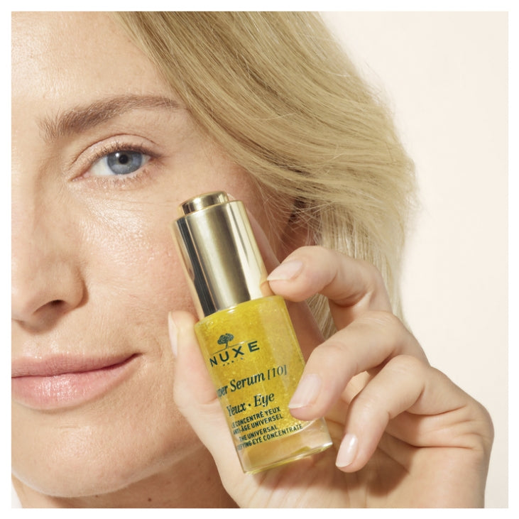 Nuxe Super Serum [10] Eyes 15 Ml Is An Anti-Aging Concentrate For The Eye Contour Area. It Corrects The Look Of Wrinkles, Dark Circles, Puffiness And Signs Of Fatigue. Crow'S Feet And Frown Lines Are Corrected, Eyelids Are Smoothed And Puffiness Is Reduced. Dark Circles Are Reduced, And The Eyes Look More Relaxed, Luminous And Rejuvenated. Vegan. 96% Ingredients Of Natural Origin. Made In France
