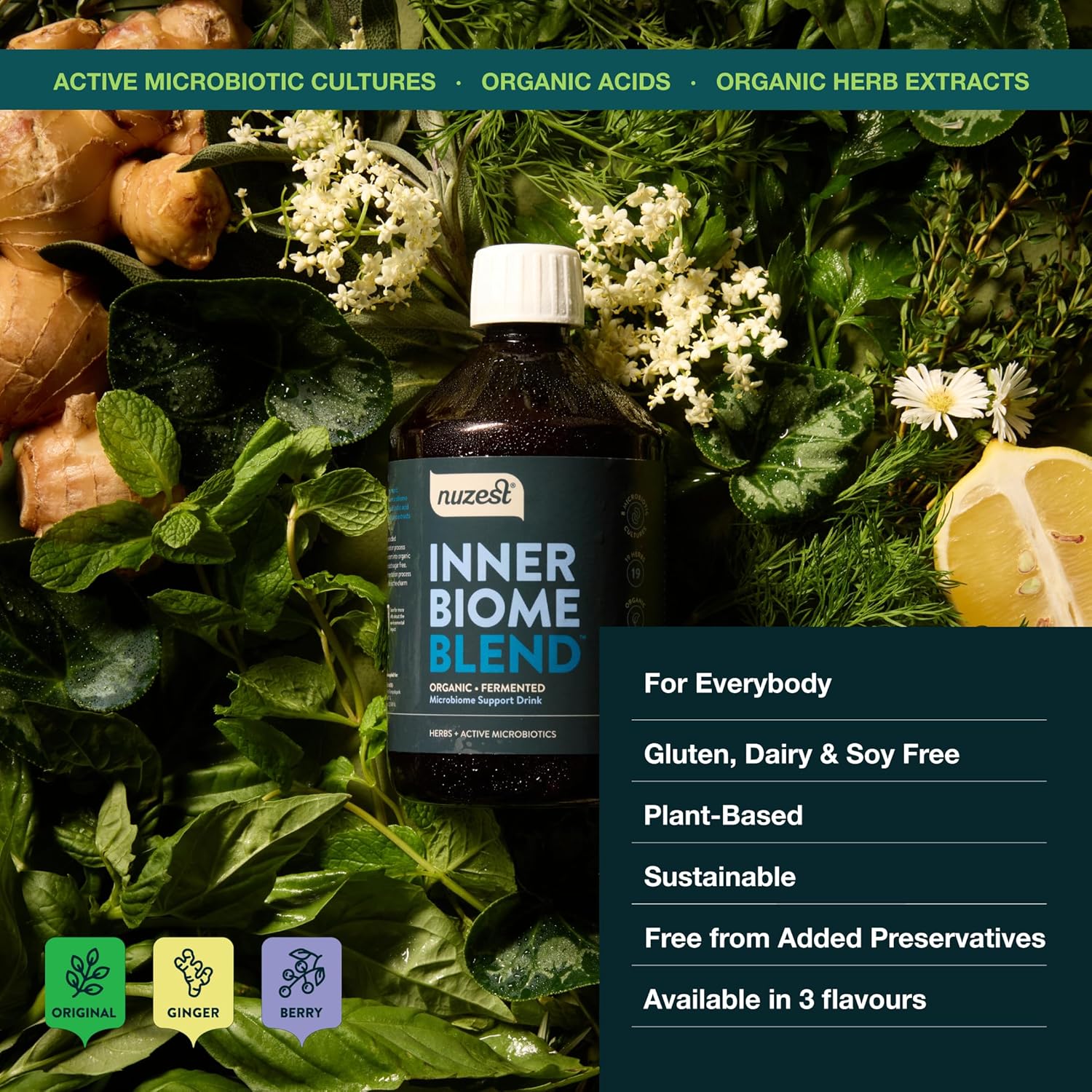 Nuzest - Inner Biome Blend – Liquid Probiotic – Digestive Health & Microbiome Support – 8 Microbiotic Cultures, 19 Fermented Herbs - Vegan Microbiotics For Gut Health – Organic - (500Ml, Berry)