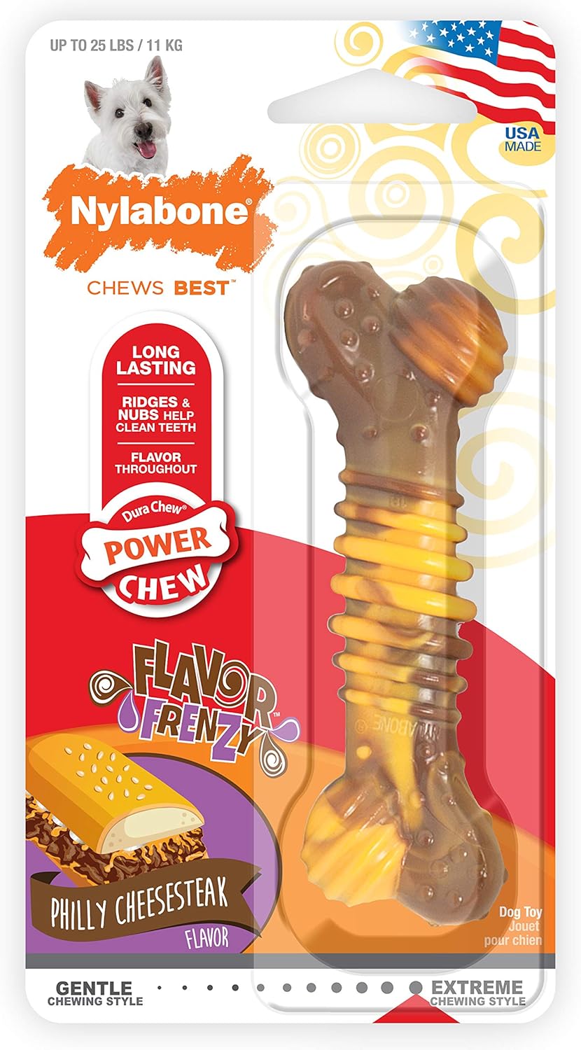 Nylabone Power Chew Flavor Frenzy Dental Bone Chew Toy For Dogs, Indestructible Chew Toys For Aggressive Chewers, Philly Cheesesteak Flavor, Small/Regular - Up To 25 Ibs. (1 Count)