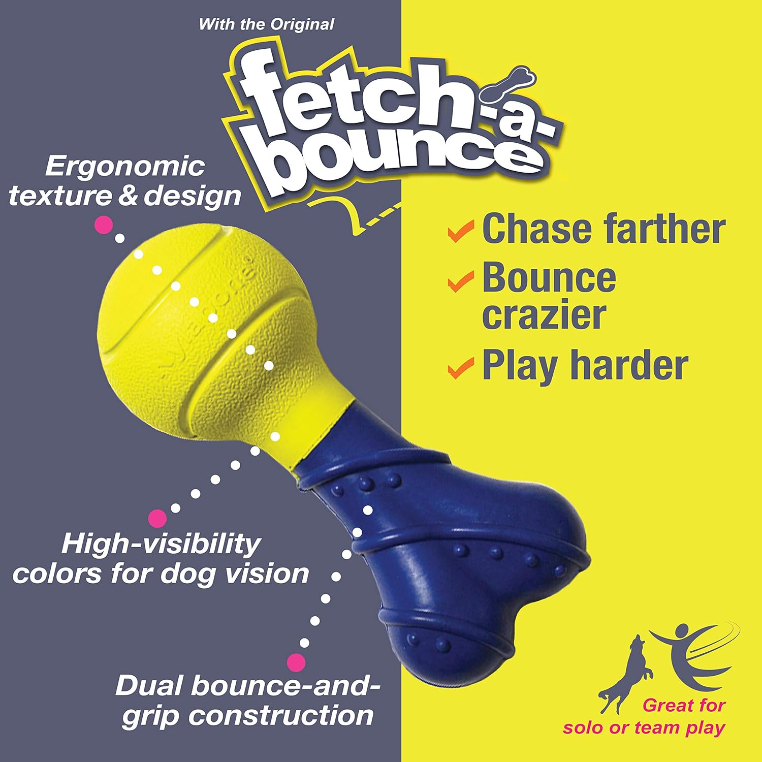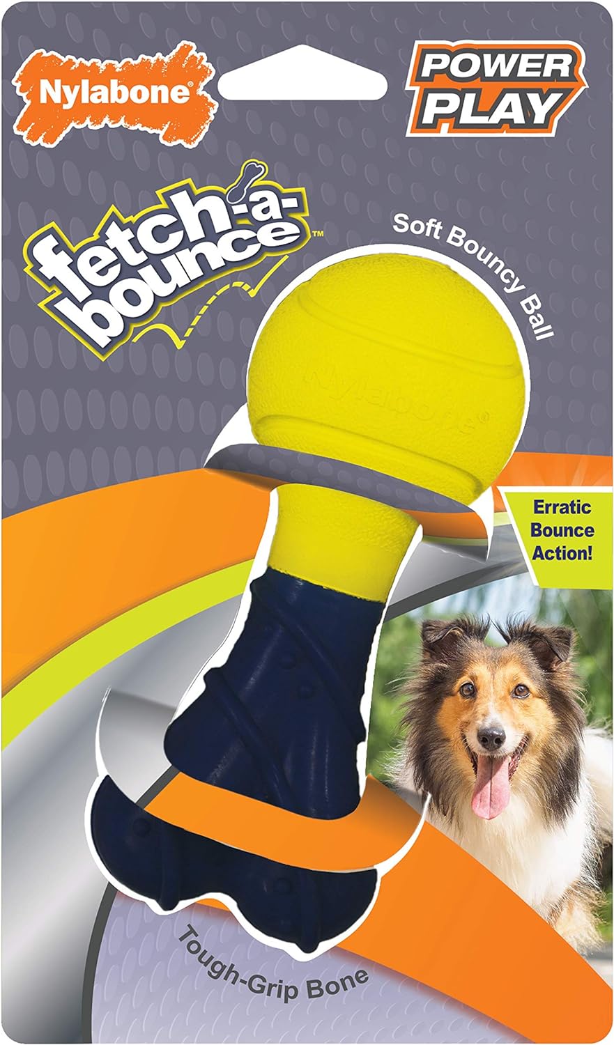Power Up Playtime With Power Play Dog Toys From Nylabone! The Dual-Sided Fetch-A-Bounce Gives Your Furry Friend The Best Of Both Worlds With A Bouncy Dog Ball On One End And A Tough-Grip Bone On The Other. Built With Ultra-Strong, Heavy-Duty Natural Rubber, The Ball End Creates A Fascinating Erratic Bounce While The Bone Gives Your Dog The Familiar Shape They Love. Perfect For A Game Of Fling And Fetch, This Interactive Dog Toy Can Soar Up To 80 Feet! Give It A Throw And Watch Your Four-Legged Play Buddy Enjoy The Toys Different Flight Patterns, From Flipping To Spiraling. Plus, Your Dog Will Easily Spot Your Fetch-A-Bounce In The Grass, Sand, Or Any Other Surface Because This Bright Blue And Yellow Dog Toy Is Designed In Colors That Are Highly Visible To Dogs. Chase Farther, Bounce Crazier, And Play Harder With The Original Fetch-A-Bounce Rubber Dog Toy!