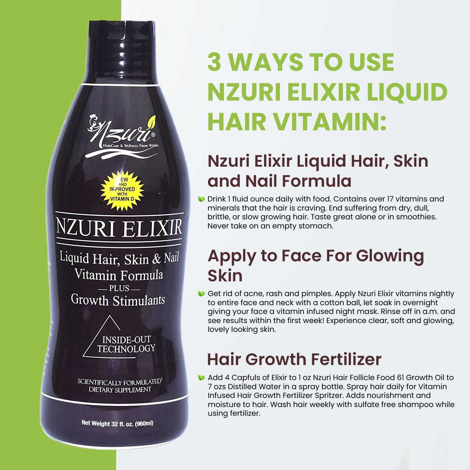 Nzuri Elixir Hair Skin and Nails Vitamins for Women and Men with Biotin, Folate, and Vitamin D for Daily Growth Supplement to Reducing Dryness, Thinning, and Loss, 32 oz