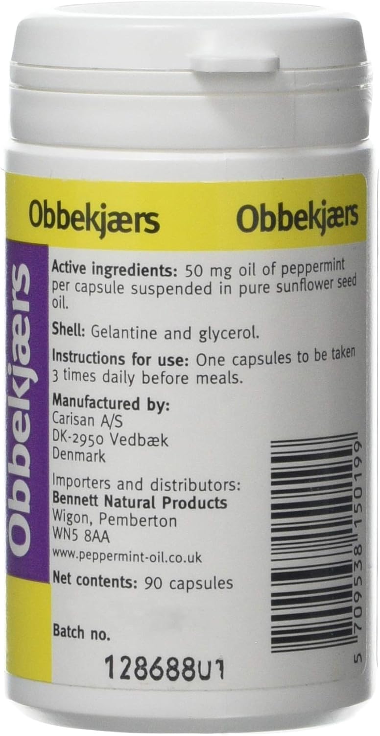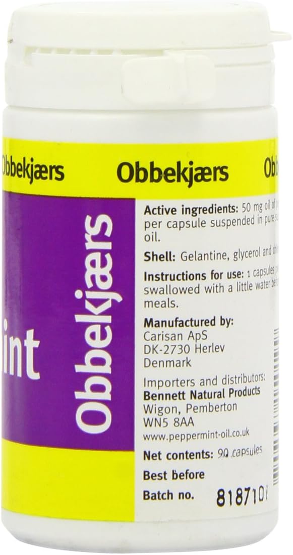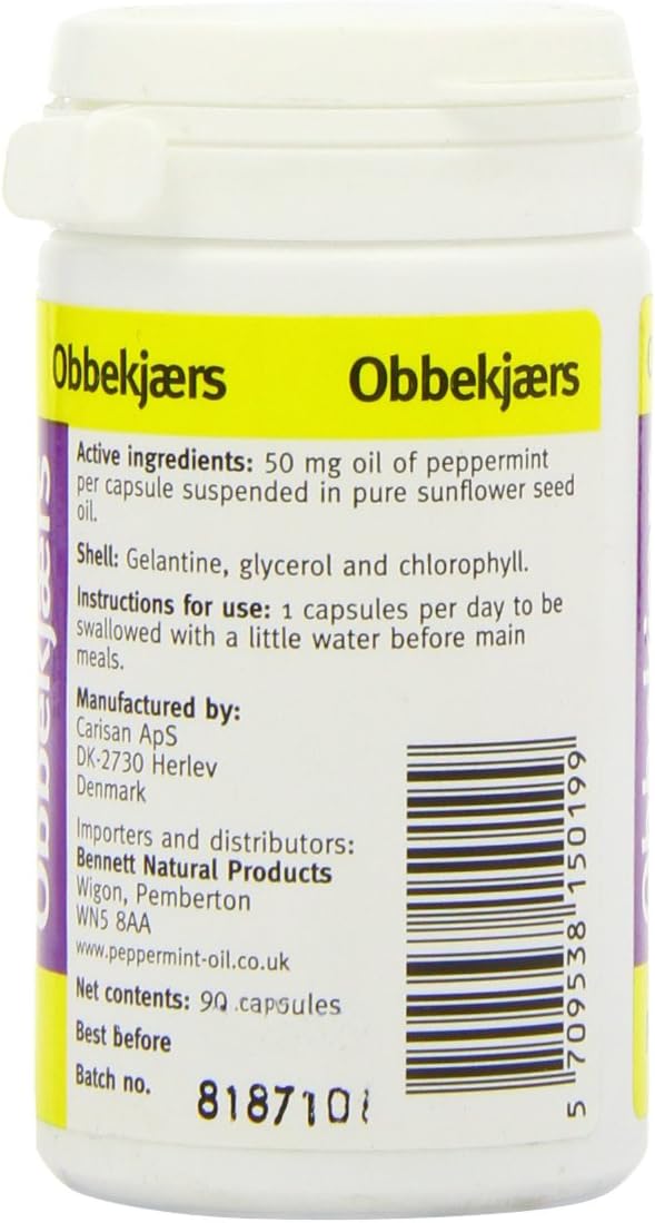 Product Description Pure peppermint oil 50mg in sunflower seed oil base in a gelatine capsule. The capsule and the oil are slow to digest, so the peppermint is carried further through the system. Ingredients 50 mg oil of peppermint per capsule suspended in pure sunflower seed oil. P.when('A').execute(function(A) { A.on('a:expander:toggle_description:toggle:collapse', function(data) { window.scroll(0, data.expander.$expander[0].offsetTop-100); }); }); Directions Swallow 1 capsule, 3 times daily before meals. Box Contains 1 x Obbekjaers 50mg Peppermint 90 Capsules See more,Sunflower seed oil base in a gelatine capsule,Capsule and the oil are slow to digest,Peppermint is carried further through the system