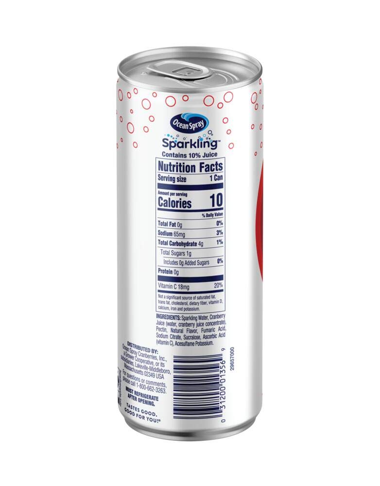 Crisp. Clean. Fizzy. Only 10 Calories. Try Ocean Spray® Sparkling Diet Cranberry Juice Drink. A One-Two Punch Of Refreshment From Real Cranberry Fruit Juice And Fizzy Water For A Diet Drink Full Of Flavor. This Sparkling Juice Drink Brings The Flavor Without Compromise. It'S Made Without High Fructose Corn Syrup, Contains Only 10 Calories And Even Has Vitamin C. Can Other Diet Drinks Say That Use This Sparkling Cranberry Juice Drink As A Cocktail Mixer In Your Favorite Beverages. Bring A Chilled Can With You To Stay Refreshed On The Go. Sparkling Diet Cranberry Juice Drink Is The Perfect Anytime Beverage. All This Made Possible By The 700+ Cranberry Farming Families That Make Up Our Co-Op. Our Owners. Our Heartbeat. Our Inspiration. Ocean Spray Believes In The Power Of The Mighty Cranberry; Born Tart. Raised Bold.™
