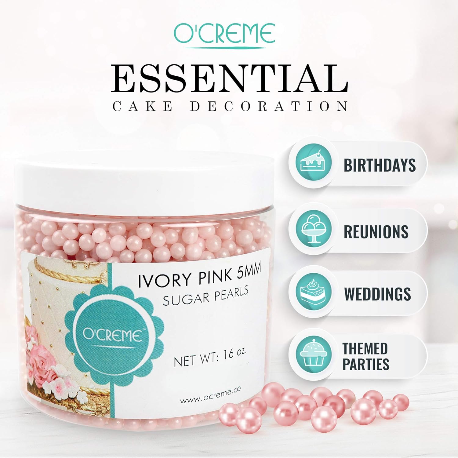 O’Creme Pink-Ivory Sugar Pearls Your desserts may be delicious, but do they look the part We know you’ve poured your heart out into making delectable and yummy confectionery for your guests, loved ones or your booming business. You used only the finest ingredients and prepared your cakes, cookies and more of your desserts with utmost care and skill. However, in the world of sweets, a delicacy should always look as good as it tastes. Presentation is part of the package. Make your desserts more luxurious and visually appealing with O’Creme Pink-Ivory Sugar Pearls! These pink-ivory cake supplies will definitely elevate your dessert arrangement. Don’t let your family, guests and customers get bored with plain and dull-looking confectionery. The more appetizing and deluxe-looking your sweet treats are, the higher the chance of people taking a bite! Shimmering pink-ivory spheres are a must-have for cake decorations during weddings, reunions, birthdays and themed parties. O’Creme’s creations are the ideal size for making intricate patterns and creative embellishments on icings, fondants, cookies and more! Still not convinced Here are more reasons O’creme pink-ivory Sugar Pearl Sprinkles are all the dessert toppings you’ll need ? Peanut-free ? Safe & Non-toxic ? Looks great on cake pops You’re one button away from creating elegant and flaunt-worthy desserts! Add O’Creme Pink-Ivory Sugar Pearl Sprinkles to your Cart TODAY!,?? MAKE IT SPARKLE – Surprise your party guests with luxurious-looking desserts! Decorating your favorite confectionery with our lustrous pink-ivory colored pearl spheres will surely elevate your presentation,?? GREAT FOR MOST DESSERTS – Our pink-ivory sugar pearls are classy for wedding and birthday cakes. But you can also use them to embellish cookies, cupcakes, ice cream, fondant and pastries for added pizzazz,?? DECORATE MORE – Unlike other toppings, each pack of our cake supplies contains enough sparkling balls to adorn many treats. Bedeck more desserts with our 8 oz. pink-ivory sugar pearls,?? CERTIFIED – Not For Passover. Under the supervision of Rav Dott. Alberto Avraham Sermoneta - Comunita Ebraica Bologna,?? 100% SATISFACTION GUARANTEED – We’re confident you’ll love our dessert decorations. In the rare case that we don’t meet your expectations, you can always count on our money-back guarantee
