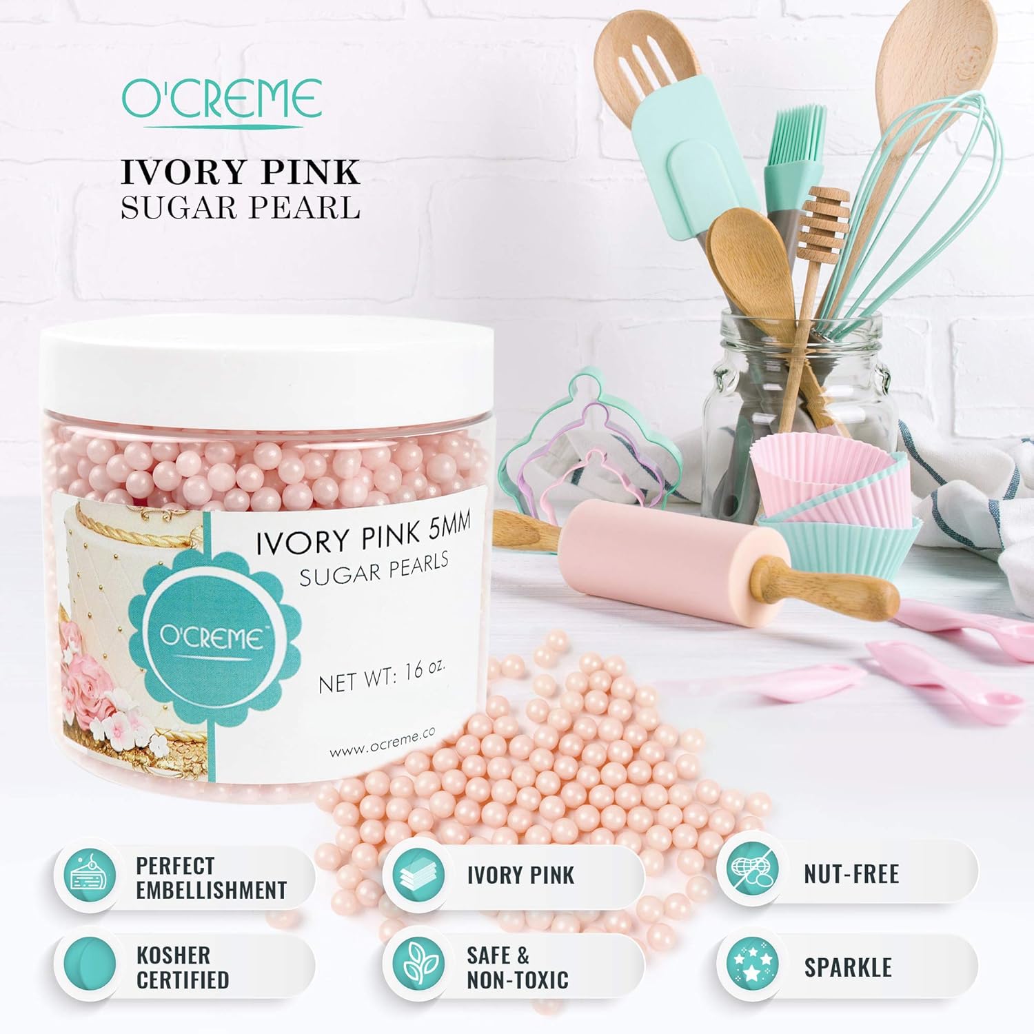 O'Creme Pink-Ivory Edible Sugar Pearls Cake Decorating Supplies For Bakers: Cookie, Cupcake & Icing Toppings, Beads Sprinkles For Baking, Certified, Candy Sugar Ball Accents (5Mm, 16 Oz)