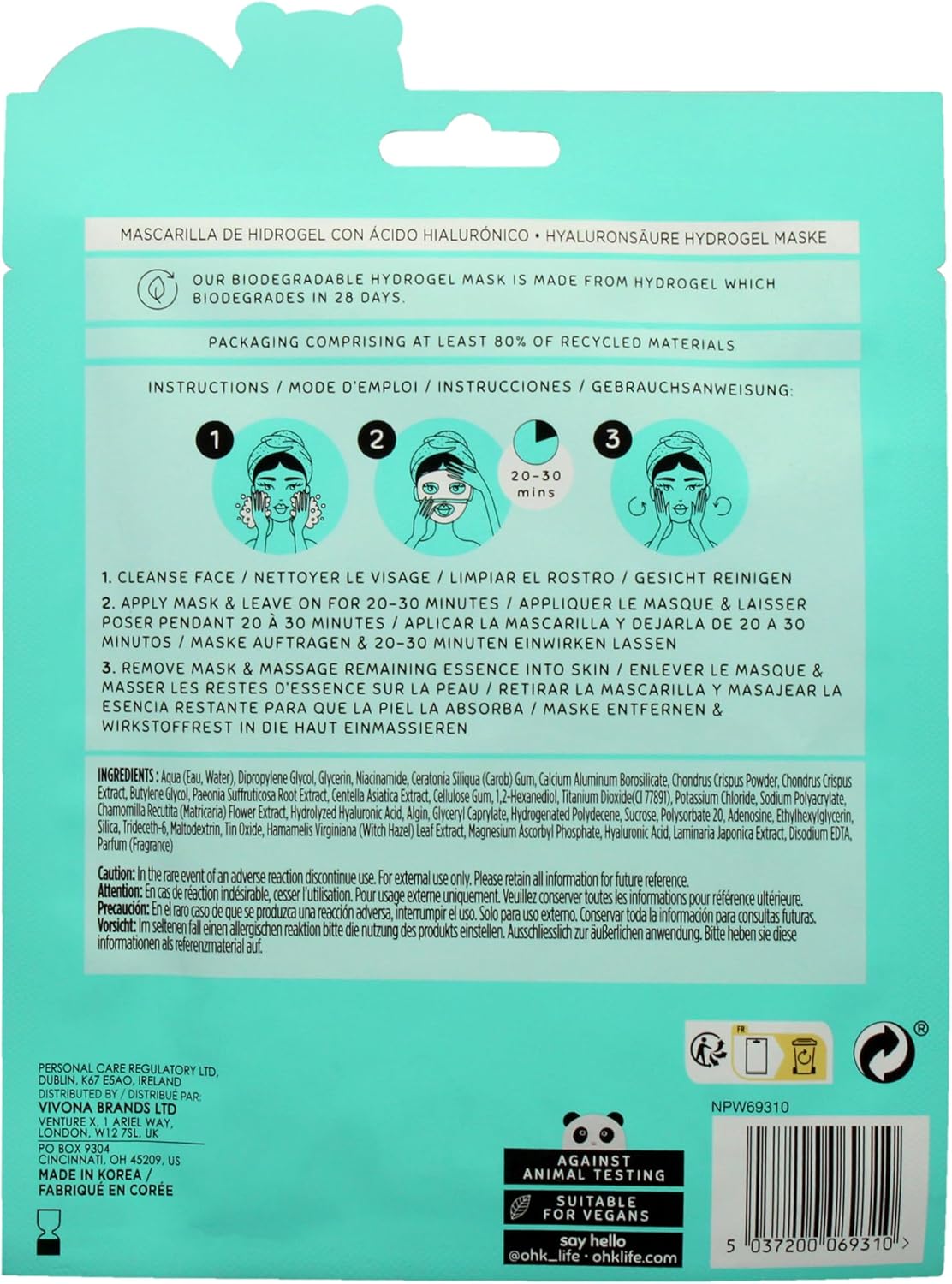 Oh K! Vitamin C Sheet Mask For Dry And Dehydrated Skin, With Added Hyaluronic Acid, Brightening Face Mask, Biodegradable, Vegan And Cruelty Free, 41G
