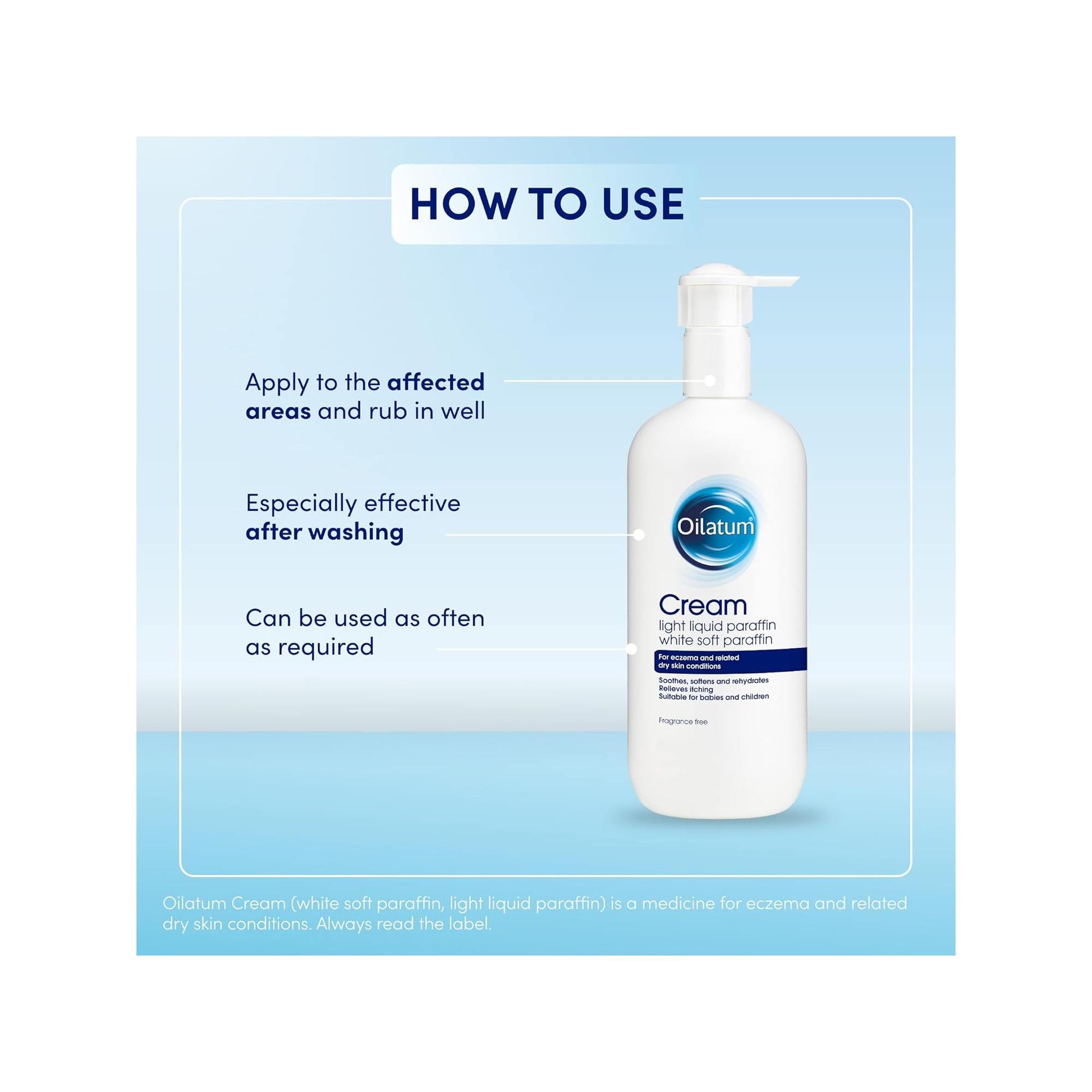 To Use, Apply To Affected Area. Use As Often As Required. Suitable For Moisturising Skin After Washing, To Counteract The Loss Of Water From The Skin. Oilatum Cream Is A Medicine For Eczema And Related Dry Skin Conditions. Always Read The Label. (1) Study Conducted In Adults With Dry Itchy Skin
