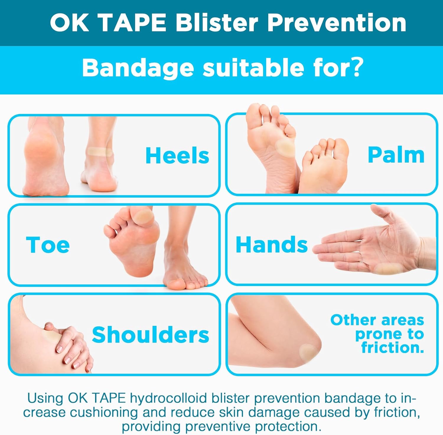 About this item [Excellent Prevention and Treatment] OK TAPE hydrocolloid bandages provide a moist wound environment for your wounds, absorbing excess exudate, accelerating wound healing, reducing pain and scar formation. A must-have for your home care kit; [Blister Protection and Pressure Relief] The hydrocolloid blister protection bandage is soft and comfortable, providing a protective barrier to cushion the wound area from external friction, pressure and contamination; [Waterproof and Sterile] The hydrocolloid anti-abrasion patch is waterproof and sweatproof, ensuring that the wound or blister is in a sealed and sterile environment. You can use it in shower and bath again with confidence; [Meet Your Needs] When you have problems with skin chafing and blisters, the hydrocolloid bandages can provide you with reliable skin protection and comfort. Suitable for sports and fitness, daily life, travel and outdoor activities, professional work environments, people with sensitive skin, as well as leisure and social occasions. [What will you get] The package contains 20pc-3 different styles of blister preventive patches to provide you with full protection.OK TAPE Hydrocolloid Anti Abrasion Patches are also made of high quality hydrocolloid material, which is latex free, so you can use them with complete peace of mind! See more product details,[Excellent Prevention and Treatment] OK TAPE hydrocolloid bandages provide a moist wound environment for your wounds, absorbing excess exudate, accelerating wound healing, reducing pain and scar formation. A must-have for your home care kit;,[Blister Protection and Pressure Relief] The hydrocolloid blister protection bandage is soft and comfortable, providing a protective barrier to cushion the wound area from external friction, pressure and contamination;,[Waterproof and Sterile] The hydrocolloid anti-abrasion patch is waterproof and sweatproof, ensuring that the wound or blister is in a sealed and sterile environment. You can use it in shower and bath again with confidence;,[Meet Your Needs] When you have problems with skin chafing and blisters, the hydrocolloid bandages can provide you with reliable skin protection and comfort. Suitable for sports and fitness, daily life, travel and outdoor activities, professional work environments, people with sensitive skin, as well as leisure and social occasions,[What will you get] The package contains 20pc-3 different styles of blister preventive patches to provide you with full protection.OK TAPE Hydrocolloid Anti Abrasion Patches are also made of high quality hydrocolloid material, which is latex free, so you can use them with complete peace of mind!