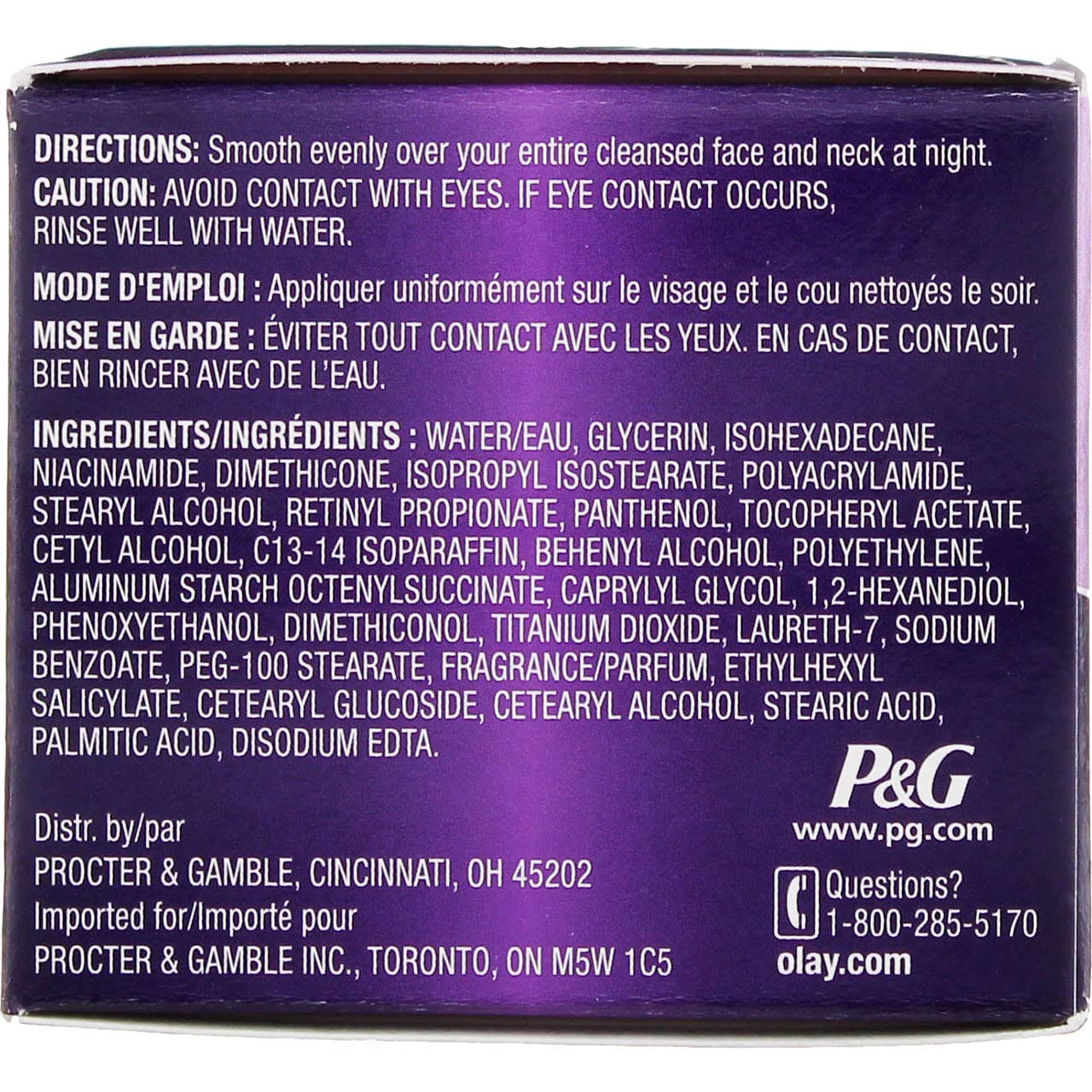 Hydrate skin to visibly smooth fine lines and wrinkles in just seven nights with Olay Age Defying Anti-Wrinkle Night Cream. ItÃâs formulated with Vitamins E, B3 and B5 to deliver nourishing hydration that works while you sleep. This fast-absorbing and oil-free overnight cream improves skinÃâs texture without clogging pores, revealing a more youthful- looking complexion every morning.Night face moisturizer provides skin with hydrating anti-wrinkle benefits & nourishmentFormulated with Vitamins E, B3 & B5 to smooth skin's textureNight cream reduces the look of wrinkles in just 7 nightsLightweight, oil-free formula won't clog poresPart of the Olay Age Defying Anti-Wrinkle collection Ingredients Water, Glycerin, Isohexadecane, Niacinamide, Dimethicone, Isopropyl Isostearate, Polyacrylamide, Titanium Dioxide, Panthenol, Tocopheryl Acetate, Retinyl Propionate, Ethylhexyl Salicylate, Ascorbic Acid, Stearyl Alcohol, C13-C14 Isoparaffin, Laureth-7, Dimethiconol, Ammonium Polyacrylate, Cetyl Alcohol, Polyethylene, Aluminum Starch Octenylsuccinate, Behenyl Alcohol, Benzyl Alcohol, Cetearyl Glucoside, Cetearyl Alcohol, Ethylparaben, Stearic Acid, PEG-100 Stearate, Propylparaben, Disodium EDTA, Fragrance. Instructions Smooth over cleansed face and neck every night for renewing hydration throughout the night. Warnings Safety Warning: Avoid contact with eyes