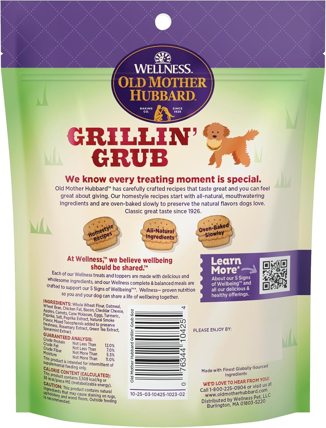 Old Mother Hubbard By Wellness Grillin' Grub Bacon, Cheese & Hickory Smoke Flavored Natural Dog Treats, Crunchy Oven-Baked Biscuits, Ideal For Training, 6 Ounce Bag