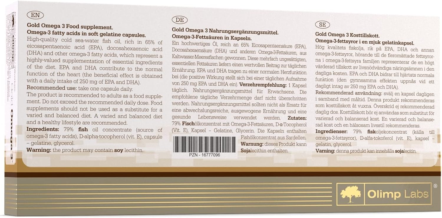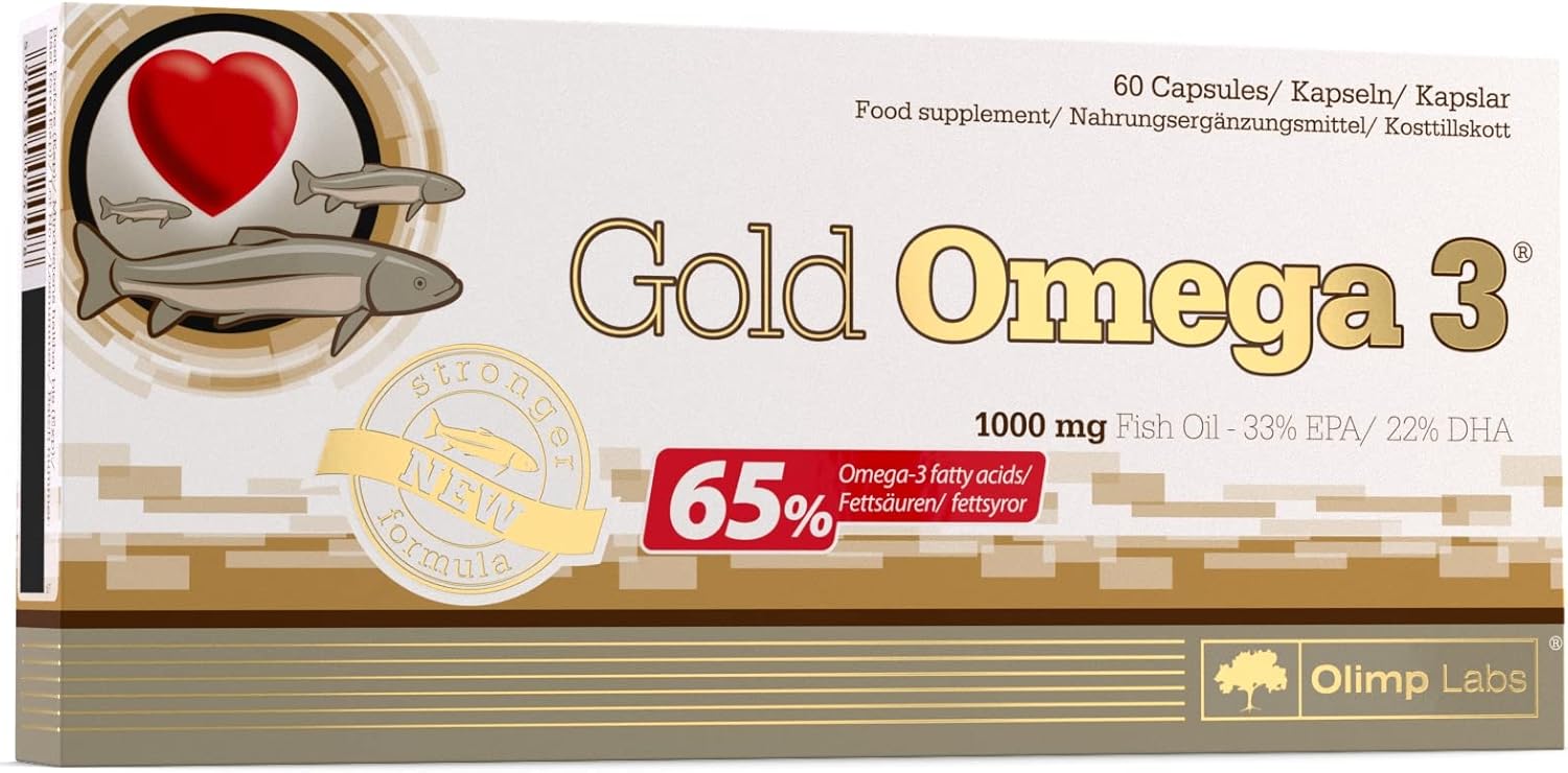 Gold Omega 3 is the guardian of your heart! Manufactured by Olimp Laboratories, the dietary supplement contains high amounts of Omega 3 unsaturated fatty acids β essential in the diet of every person who wants to take care of the proper functioning of the heart, brain, cardiovascular system, and of better eyesight. Due to the fact that the human body is not able to produce OmegaΒ¬3 fatty acids on its own, it is worth supplying them from external sources. A quick and easy way to supplement your daily diet with Omega 3 unsaturated fatty acids is to use high quality products. To this end, in order to meet the expectations of their customers, specialists from Olimp Laboratories, using innovative technology, created Gold Omega 3. One of the top products of the Olimp Labs brand, it is an enhanced formula containing a high quality cold water fish oil concentrate with a high concentration of Omega 3 fatty acids of up to 65%! Each of the soft, easy to swallow capsules allows you to deliver up to 1000 mg of Omega 3 fatty acids every day, especially including EPA and DHA! Scientific research has shown that these acids have a positive effect on the functioning of the heart, brain, circulatory system, and eyesight. Taken daily in the total dose of 250 mg, EPA (eicosapentaenoic acid) and DHA (docosahexaenoic acid), contribute to the proper functioning of the heart. In addition, the total EPA and DHA daily intake of just 2 g helps maintain an adequate level of triglycerides in the blood. Remember, however, not to take more than 5 g of EPA and DHA acids daily. Proper brain function and vision, on the other hand, are supported, according to studies, by the daily intake of just 250 mg of DHA acid. In turn, the addition of vitamin E, which is an excellent antioxidant, helps protect cells from oxidative stress. Take care of your heart with Gold Omega 3!,VALUABLE OMEGA 3 FATTY ACIDS β dietary supplement containing essential high quality omega 3 fatty acids, which have positive effects on the heart, brain, eyesight, and cardiovascular system,SUPPORTS THE HEART FUNCTION β each soft capsule contains eicosapentaenoic acid (EPA) and docosahexaenoic acid (DHA), which in the case of a total daily intake of 250 mg support the proper functioning of the heart,SUPPORTS THE BRAIN FUNCTION AND EYESIGHT β supplementation with the Olimp Labs product has a positive effect on proper brain function and vision. This effect can be achieved with the daily use of 250 mg of DHA acid,BENEFICIAL EFFECTS ON THE CIRCULATORY SYSTEM β EPA and DHA help maintain the proper levels of triglycerides in the blood. The beneficial effects occur when 2 g of EPA and DHA are used daily, but no more than a total of 5 g of the acids should be taken,ONE PACKAGE, TWO MONTHS OF USE β Olimp Gold Omega 3 package contains as many as 60 easy to swallow, soft capsules, which constitutes as many as 60 manufacturer suggested doses. This gives us two months of supplementation