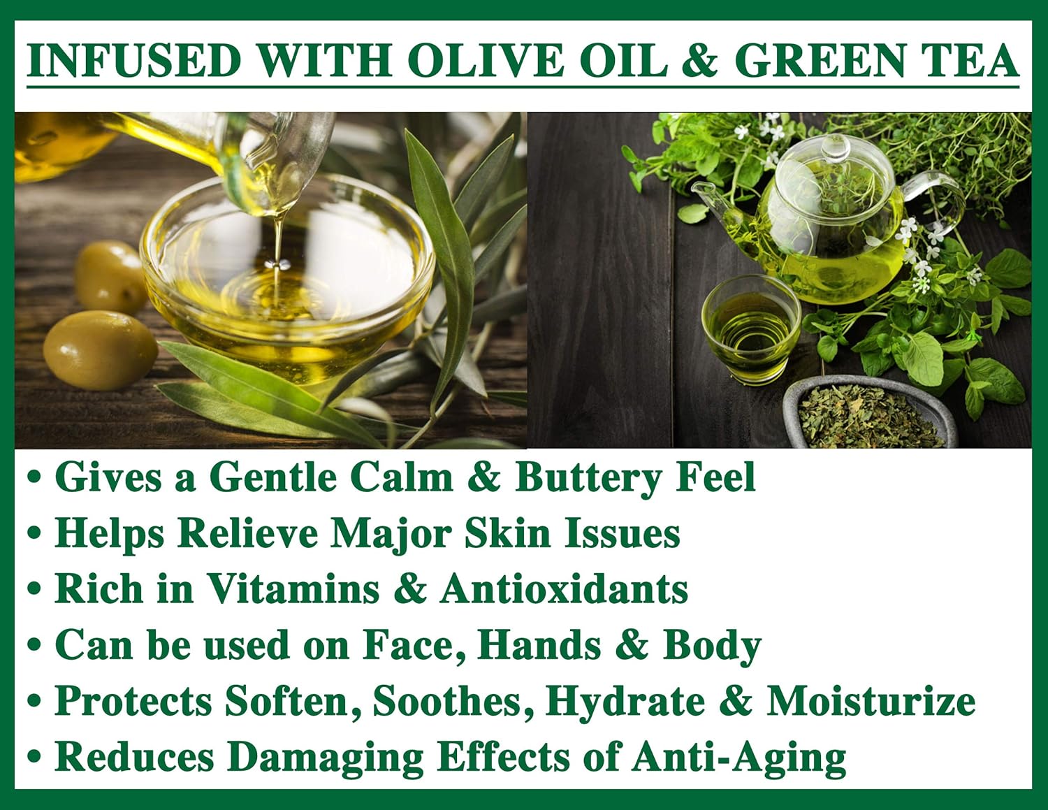 ? INFUSED WITH OLIVE OIL & GREEN TEA: Olive oil is known to be a perfect skin Moisturizer and gives a very clean and buttery feel. It gives a very gentle and clean feel to skin and help in relieving Eczema and Psoriasis and Acne. Green Tea on the other hand is rich in antioxidants and helps in reducing Anti-aging properties, fine lines and sun damaged skin