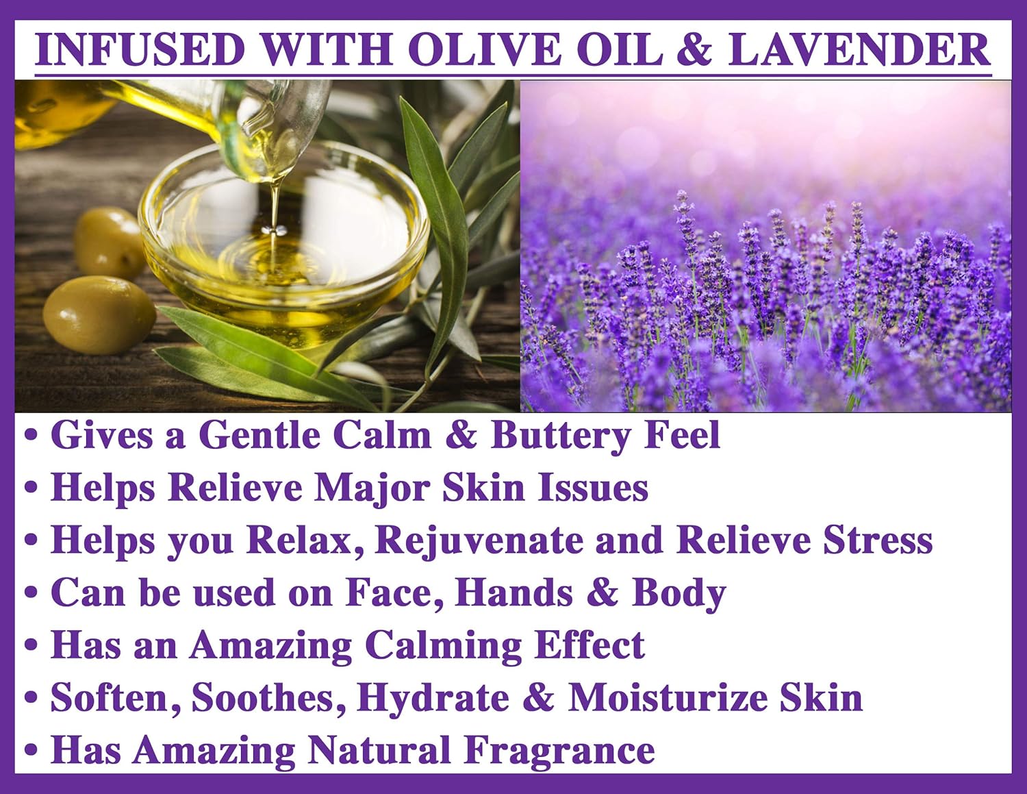 ? INFUSED WITH OLIVE OIL & LAVENDER: Olive oil is known to be a perfect skin Moisturizer and gives a very clean and buttery feel. It gives a very gentle and clean feel to skin and help in relieving Eczema and Psoriasis and Acne.Lavender scent has the perfect fragrance which helps in reducing stress, rejuvenate skin and provides relief from insect bite effects