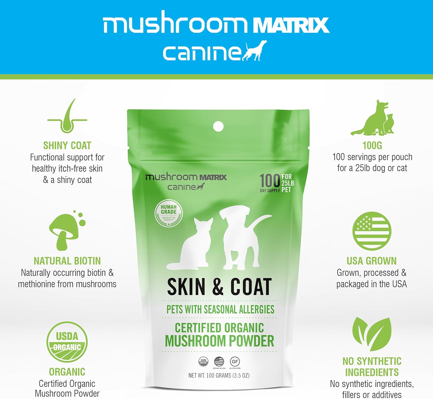 About this item Mushroom Matrix Canine Organic Mushroom Powder Skin & Coat Supplement for Dogs & Cats: Contains one 100 gram pouch of organic mushroom powder created to maintain your pet’s healthy skin & coat & support pets with seasonal allergies (100 servings for a 25 lb. pet or 50 servings for a pet weighing 50 lbs.) Functional Support: Skin & Coat mushroom powder supplement is made for animals with allergies to promote healthy skin & a shiny coat Pure Functional Mushroom Powder: With no synthetic ingredients, additives or fillers, you can treat your furry friend to the high standard, human-grade mushroom blends you would take yourself? from our sister brand Om Mushroom Recommended by Veterinarians: Naturally occurring biotin & methionine to support sensitive skin & help maintain itch-free skin & lustrous fur Certified Organic Mushrooms: Sustainably grown in our state-of-the-art, cGMP facility in Carlsbad, California Instructions: For dogs & cats, administer 1 gram (approximately 1/2 teaspoon) per 25 lbs per day. Pouch contains 100 grams, so 50 servings for 50 lb pet or 100 servings for 25 lb pet. › See more product details,Mushroom Matrix Canine Organic Mushroom Powder Skin & Coat Supplement for Dogs & Cats: Contains one 100 gram pouch of organic mushroom powder created to maintain your pet’s healthy skin & coat & support pets with seasonal allergies (100 servings for a 25 lb. pet or 50 servings for a pet weighing 50 lbs.),Functional Support: Skin & Coat mushroom powder supplement is made for animals with allergies to promote healthy skin & a shiny coat,Pure Functional Mushroom Powder: With no synthetic ingredients, additives or fillers, you can treat your furry friend to the high standard, human-grade mushroom blends you would take yourself? from our sister brand Om Mushroom,Recommended by Veterinarians: Naturally occurring biotin & methionine to support sensitive skin & help maintain itch-free skin & lustrous fur,Certified Organic Mushrooms: Sustainably grown in our state-of-the-art, cGMP facility in Carlsbad, California,Instructions: For dogs & cats, administer 1 gram (approximately 1/2 teaspoon) per 25 lbs per day. Pouch contains 100 grams, so 50 servings for 50 lb pet or 100 servings for 25 lb pet