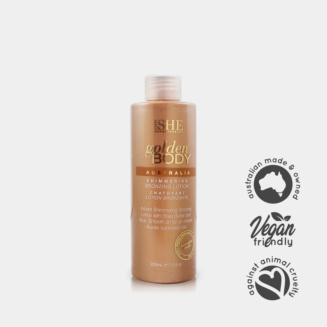 Om She Aromatherapy Golden Body Shimmering Bronzing Lotion 7.0Fl Oz - Self Tanning, Instant Tan Colour. Australian Made