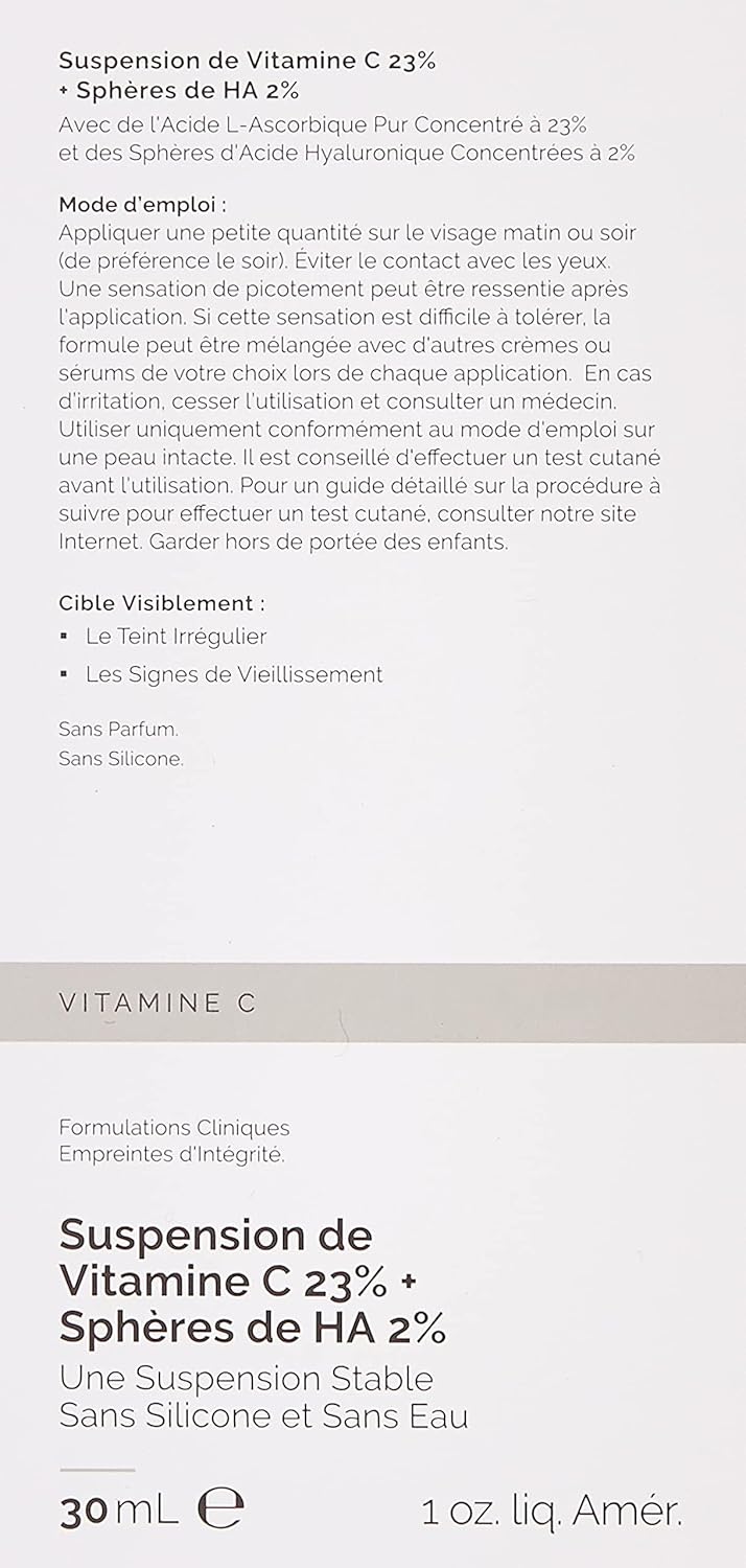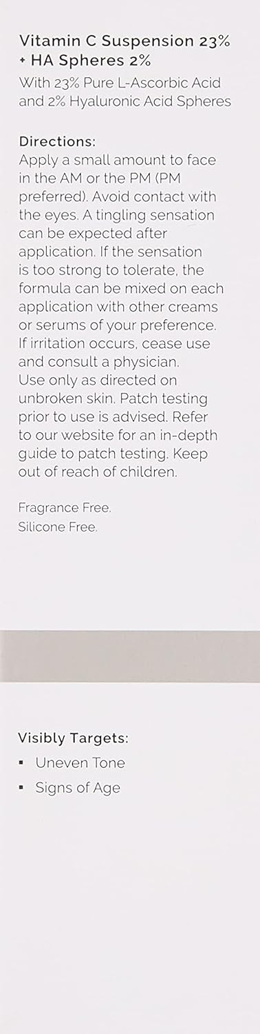 Vitamin C Suspension 23% in HA Spheres uses direct vitamin C and hyaluronic acid to help visibly reduce signs of aging by brightening and balancing uneven skin tone. This water-free formula provides 23% pure l-ascorbic acid which remains completely stable due to the absence of water. What’s more, this water-free formula is supported with spheres of hyaluronic acid for added hydration.