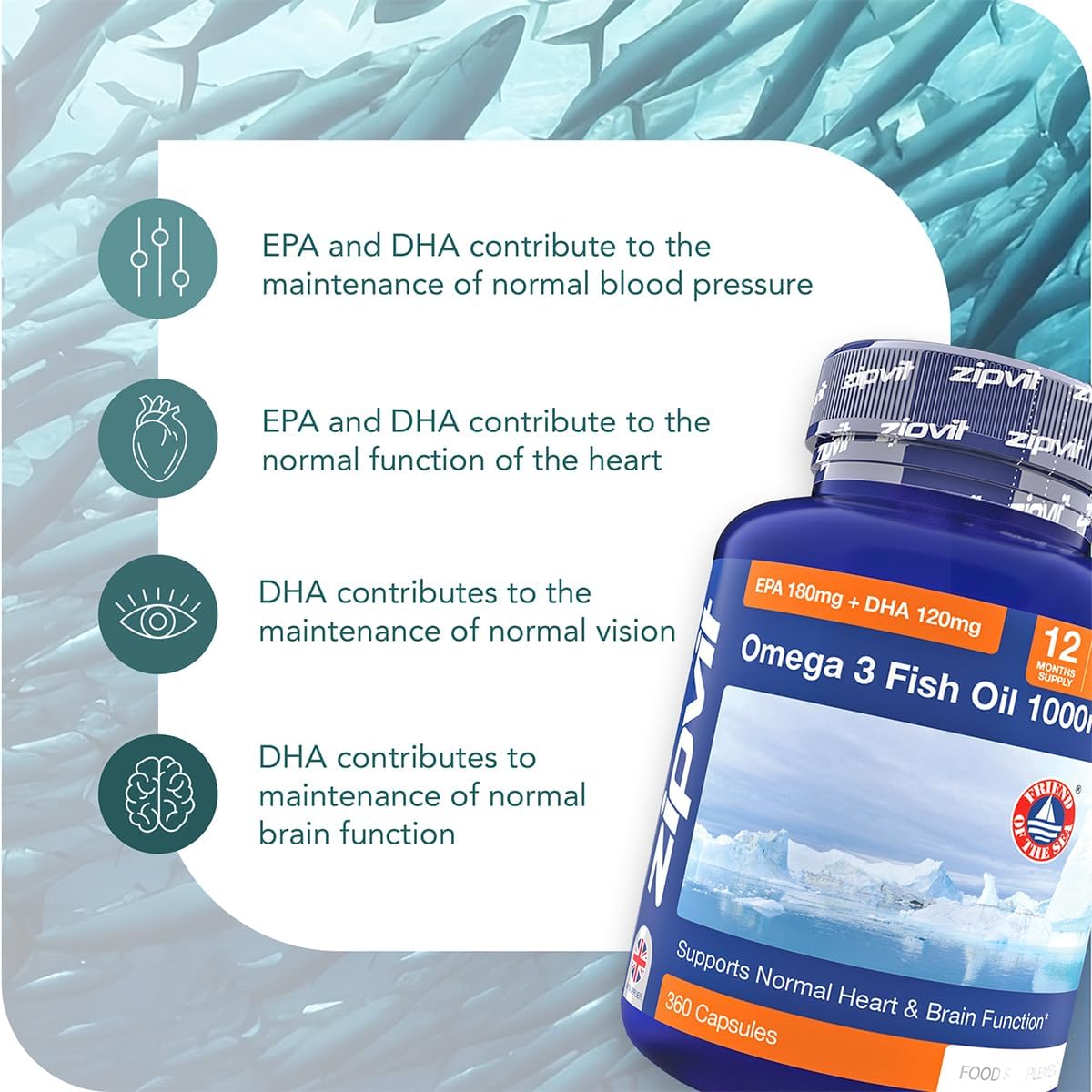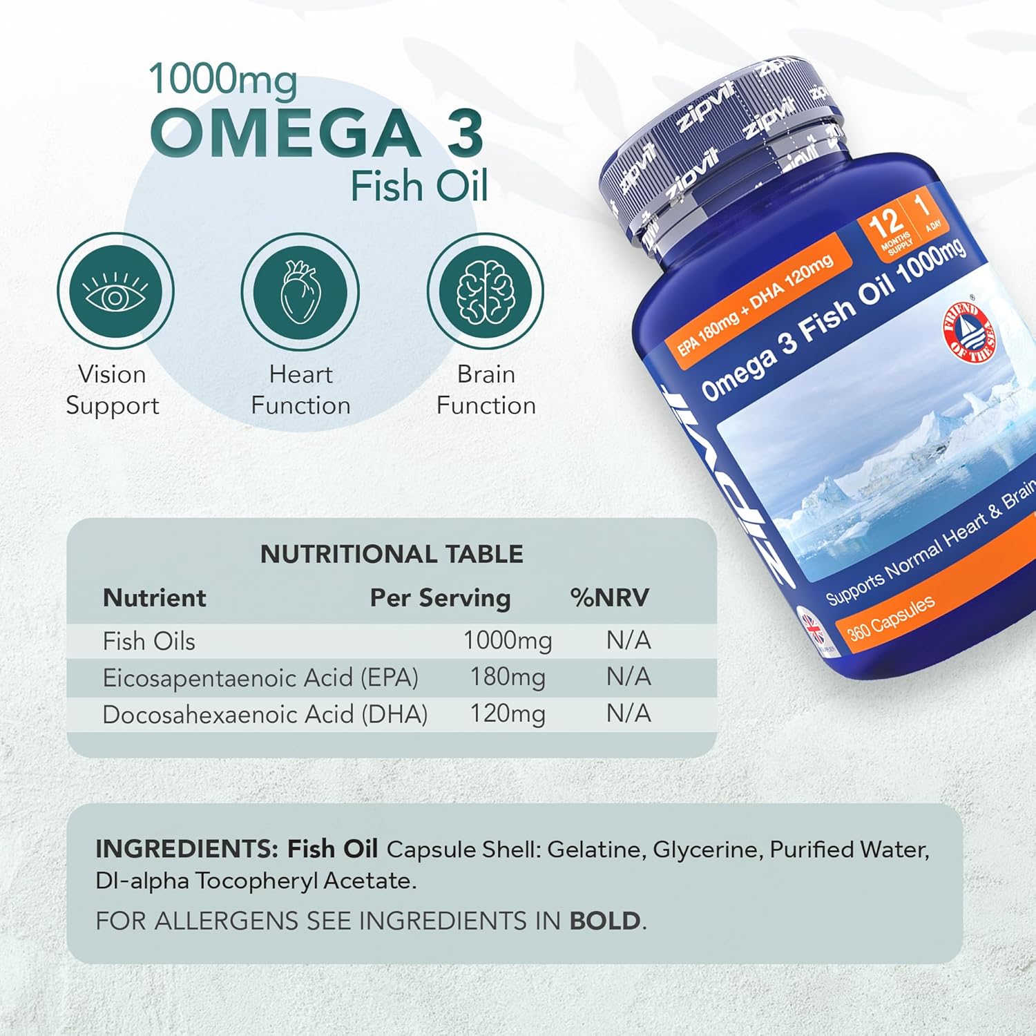 Omega 3 Fish Oil 1000Mg, 360 Softgel Capsules. 12 Months Supply. Epa 180Mg Dha 120Mg. Supports Heart, Brain Function And Eye Health