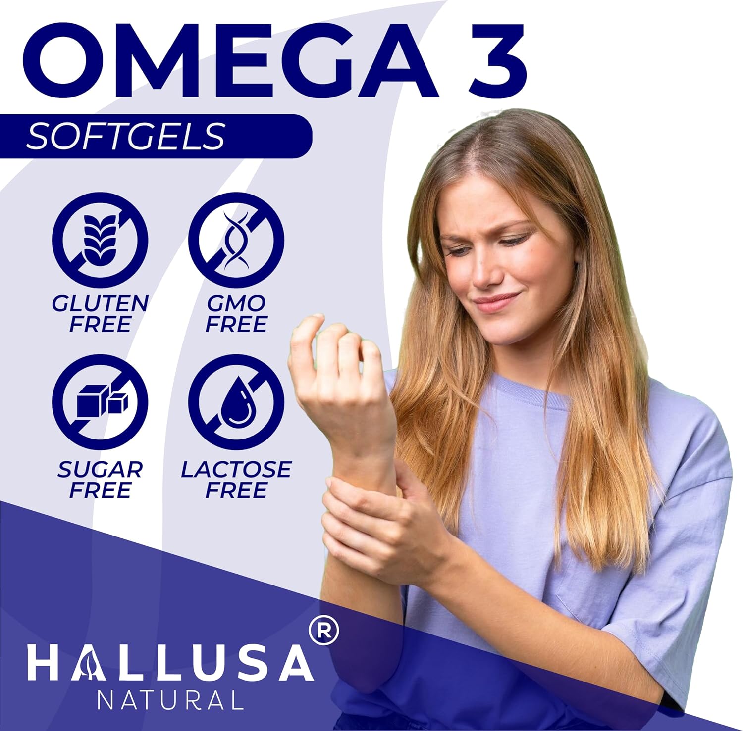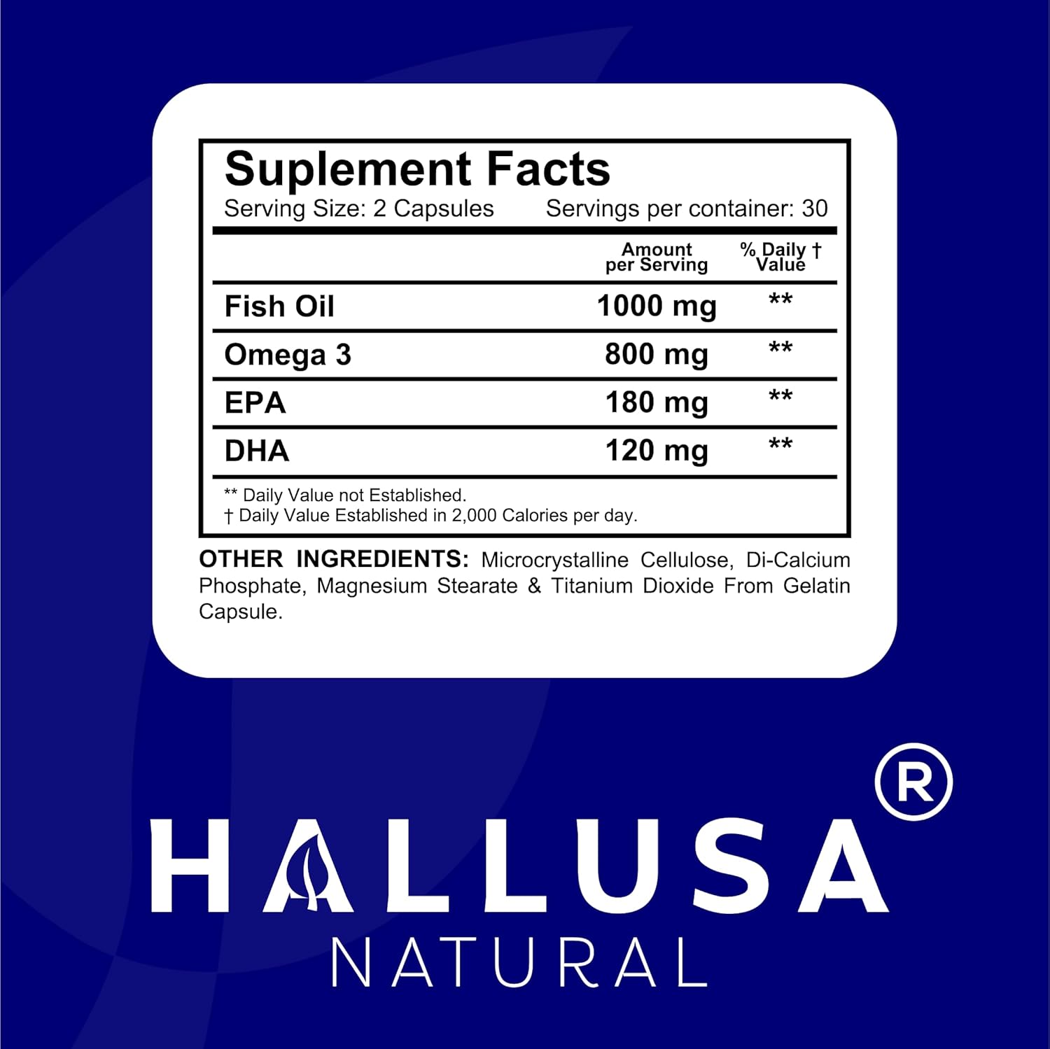 About this item  PURE FISH OIL 1000MG PER SERVING – Each softgel delivers 1000mg of high-quality fish oil with 300mg of total Omega-3s including EPA (180mg) and DHA (120mg), key fatty acids for daily wellness.  OMEGA 3 FATTY ACIDS FOR DAILY SUPPORT – Designed to complement a healthy routine focused on balanced wellness. Omega 3 fatty acids are widely included in nutritional plans for heart and joint support.  NO FISHY AFTERTASTE – EASY TO SWALLOW – Our softgels are odorless, unflavored and made for easy digestion, ideal for daily use without unpleasant burps or lingering taste.  WELLNESS SUPPORT FOR ACTIVE LIFESTYLES – Crafted to support joint mobility, general circulation, and healthy metabolic balance as part of your nutritional routine.  HALLUSA NATURAL – QUALITY YOU CAN TRUST – Non-GMO fish oil, made in GMP-certified facilities in the USA. No artificial additives or harsh fillers.  See more product details, PURE FISH OIL 1000MG PER SERVING – Each softgel delivers 1000mg of high-quality fish oil with 300mg of total Omega-3s including EPA (180mg) and DHA (120mg), key fatty acids for daily wellness, OMEGA 3 FATTY ACIDS FOR DAILY SUPPORT – Designed to complement a healthy routine focused on balanced wellness. Omega 3 fatty acids are widely included in nutritional plans for heart and joint support, NO FISHY AFTERTASTE – EASY TO SWALLOW – Our softgels are odorless, unflavored and made for easy digestion, ideal for daily use without unpleasant burps or lingering taste, WELLNESS SUPPORT FOR ACTIVE LIFESTYLES – Crafted to support joint mobility, general circulation, and healthy metabolic balance as part of your nutritional routine, HALLUSA NATURAL – QUALITY YOU CAN TRUST – Non-GMO fish oil, made in GMP-certified facilities in the USA. No artificial additives or harsh fillers
