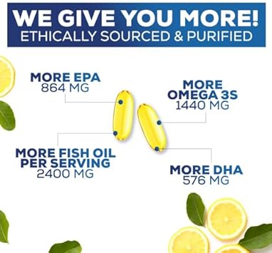 About this item Omega 3 Fish Oil: High-quality softgels packed with Omega3 essential fatty acids EPA & DHA which to support heart and brain health Purity & Quality Assured: Rigorously tested to meet or exceed purity & safety requirements for Heavy Metals and other contaminants - Ensuring only the highest quality ingredients Great Absorption & No Fishy Aftertaste: Specially formulated Omega Three with an ethyl ester molecular form for optimal absorption and a natural lemon flavor to minimize fishy burps and aftertaste Ethically Sourced & Trusted Formula: Bottled in the USA & made from high-quality, ethically sourced fish, these fish oil supplements are crafted responsibly and third-party tested for quality & purity Omega 3 Fish Oil Supplement 2400 mg: Omega3 omega three extra strength high dha epa epadha fatty acid for humans adults women men kids from health nutrition naturals best wild caught natural vitamins acids fishoil oul triple strength extra free burpless lemon joint brain heart support oils triglyceride pescado omegas onega omaga omga omaga3 softgels gummies chewable liquid aceite gomitas gummy pills capsules 2400mg 1200 mg 1200  See more product details,Omega 3 Fish Oil: High-quality softgels packed with Omega3 essential fatty acids EPA & DHA which to support heart and brain health,Purity & Quality Assured: Rigorously tested to meet or exceed purity & safety requirements for Heavy Metals and other contaminants - Ensuring only the highest quality ingredients,Great Absorption & No Fishy Aftertaste: Specially formulated Omega Three with an ethyl ester molecular form for optimal absorption and a natural lemon flavor to minimize fishy burps and aftertaste,Ethically Sourced & Trusted Formula: Bottled in the USA & made from high-quality, ethically sourced fish, these fish oil supplements are crafted responsibly and third-party tested for quality & purity,Omega 3 Fish Oil Supplement 2400 mg: Omega3 omega three extra strength high dha epa epadha fatty acid for humans adults women men kids from health nutrition naturals best wild caught natural vitamins acids fishoil oul triple strength extra free burpless lemon joint brain heart support oils triglyceride pescado omegas onega omaga omga omaga3 softgels gummies chewable liquid aceite gomitas gummy pills capsules 2400mg 1200 mg 1200