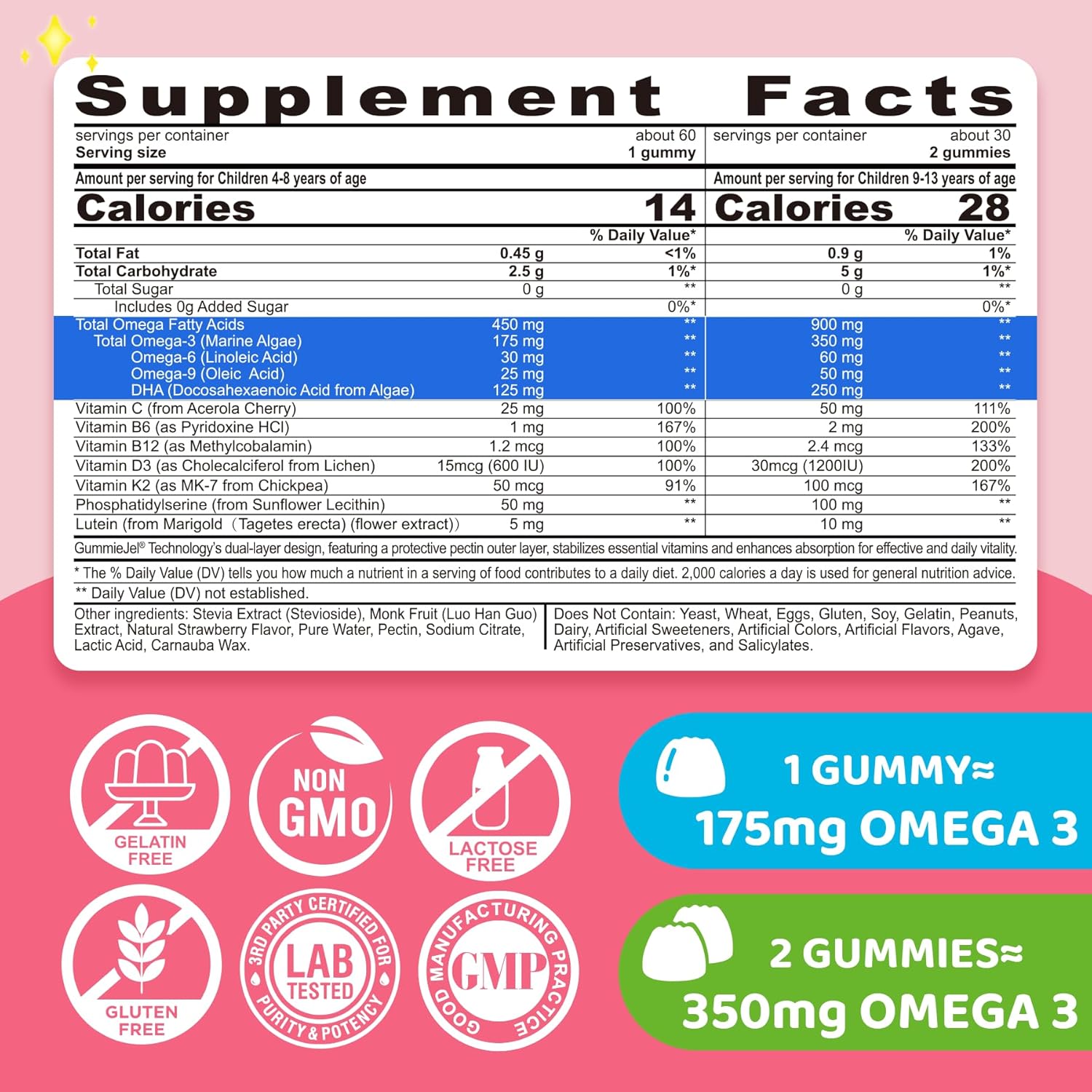 Omega 3 Gummies For Kids 4+, With Dha, Vitamin D3 K2, C, B6 B12, Luetin & Omega 3 6 9, No Fish Taste, Sugar Free Kids Vitamins Gummies, For Brain Bone Eyes Focus Immunity, Fish Oil Alternative, 120Cts