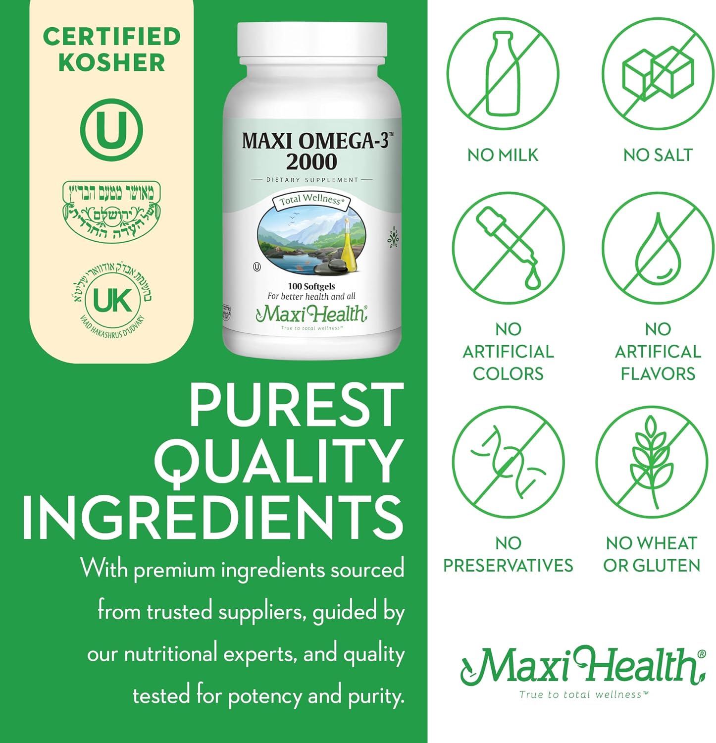 About this item ASTONISHING HEALTH BENEFITS: Science-Backed Benefits Of Omega 3 Fish Oil Include Increased Brain Health During Pregnancy And Early Life, Plus Organ, Mental, And Heart Health In Children and Adults Of All Ages. Contains 360mg EPA and 240mg DHA. TRIPLE STRENGTH FISH OIL: Our Fish Oil Supplements Provide Essential Fatty Acids With A Potently High Concentration Of 2000mg Of Fish Oil Omega 3 Per Capsule, Derived From Kosher Wild Salmon, Anchovy, Sardines, And Mackerel NO FISHY AFTERTASTE: Thousands Of Satisfied Customers Have Reported No Fish Burps Or Fish Smell When Taking Maxi Health’s Omega 3 Fatty Acid Supplement; In Addition, Our Omega 3 2000mg Fish Oil Pills Are GMO Free And Do NOT Contain Animal Products, Or Derivatives THIRD-PARTY TESTED FOR TOXINS: Cold Extraction, Molecular Distillation and Filtration, And Rigorous Testing Ensures That Maxi Health’s Burpless Fish Oil 2000mg Omega 3 Supplement Is Free of Harmful Elements Such As Mercury, PCBs, And Other Heavy Metals MADE IN USA SINCE 1974: Made in the USA, Manufactured in a GMP Certified Facility: Maxi-Health was Established in 1974  See more product details,ASTONISHING HEALTH BENEFITS: Science-Backed Benefits Of Omega 3 Fish Oil Include Increased Brain Health During Pregnancy And Early Life, Plus Organ, Mental, And Heart Health In Children and Adults Of All Ages. Contains 360mg EPA and 240mg DHA,TRIPLE STRENGTH FISH OIL: Our Fish Oil Supplements Provide Essential Fatty Acids With A Potently High Concentration Of 2000mg Of Fish Oil Omega 3 Per Capsule, Derived From Kosher Wild Salmon, Anchovy, Sardines, And Mackerel,NO FISHY AFTERTASTE: Thousands Of Satisfied Customers Have Reported No Fish Burps Or Fish Smell When Taking Maxi Health’s Omega 3 Fatty Acid Supplement; In Addition, Our Omega 3 2000mg Fish Oil Pills Are GMO Free And Do NOT Contain Animal Products, Or Derivatives,THIRD-PARTY TESTED FOR TOXINS: Cold Extraction, Molecular Distillation and Filtration, And Rigorous Testing Ensures That Maxi Health’s Burpless Fish Oil 2000mg Omega 3 Supplement Is Free of Harmful Elements Such As Mercury, PCBs, And Other Heavy Metals,MADE IN USA SINCE 1974: Made in the USA, Manufactured in a GMP Certified Facility: Maxi-Health was Established in 1974