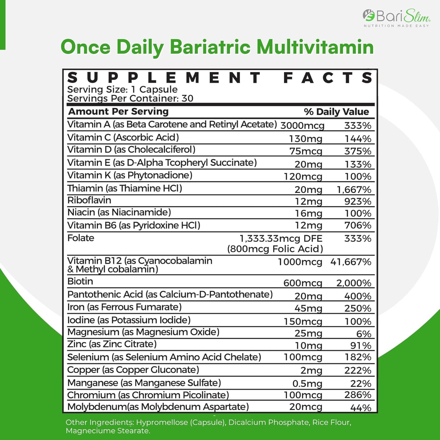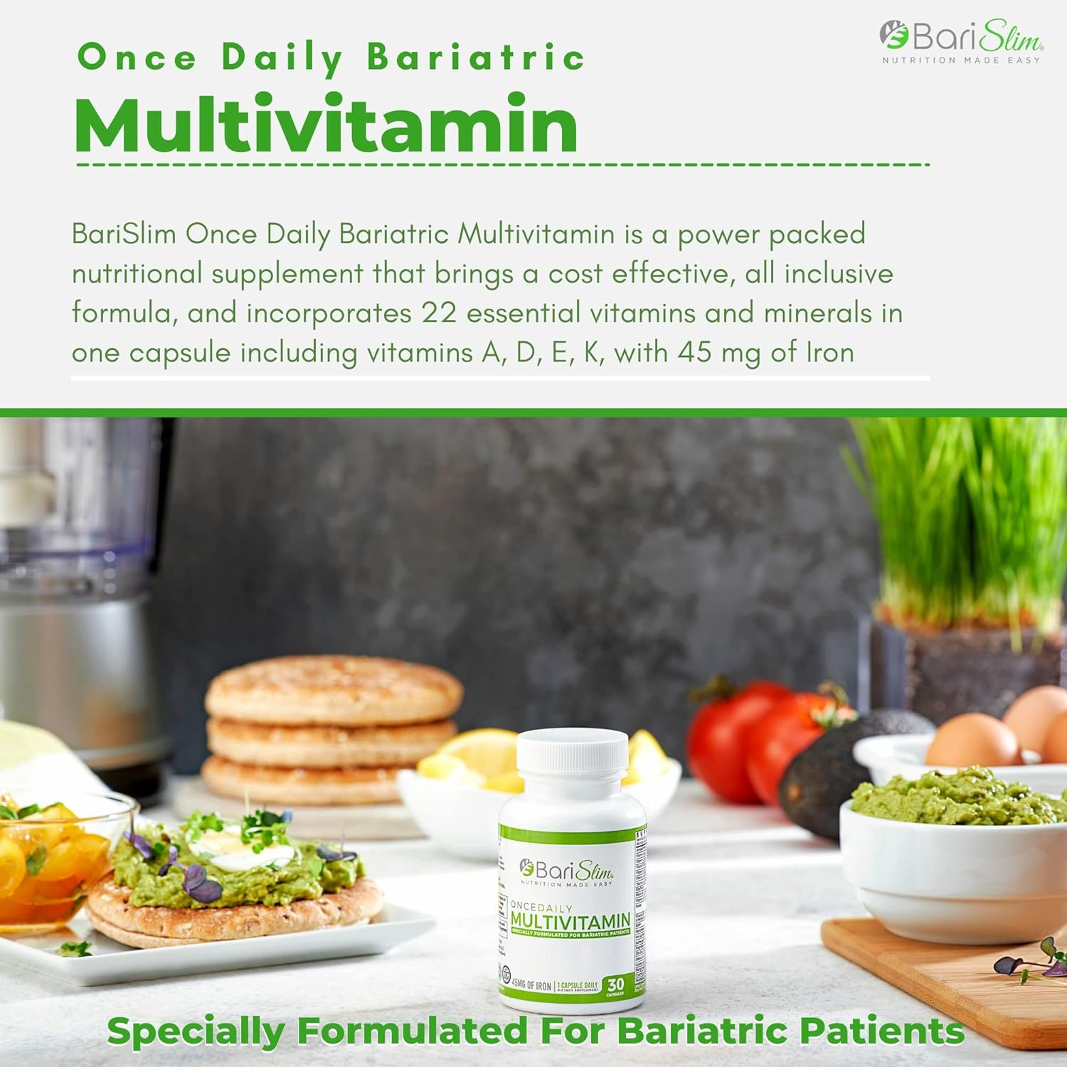 ??Comprehensive Bariatric Support?: Our BariSlim Bariatric Multivitamin Capsules are specifically designed to meet the unique nutritional needs of individuals who have undergone gastric bypass or gastric sleeve surgery. With a blend of essential Vitamins A, D, E, K, and Minerals, including 45 mg of iron, it ensures you receive vital nutrients in one convenient daily dose??Easy Once-Daily Formula?: Simplify your post-bariatric surgery supplement routine with our once-daily capsule. No need to juggle multiple pills throughout the day. We've carefully crafted this formula to provide the nutrients you need in a single, easy-to-swallow serving, making it a hassle-free addition to your daily regimen??Superior Iron Support?: BariSlim's innovative solution provides a substantial 45 mg of iron in every serving, addressing the prevalent issue of iron deficiency often encountered by bariatric surgery patients. This potent iron supplement content is specifically designed to support and combat deficiencies, promoting healthier blood and sustainable energy levels, so you can regain your vitality??30 Servings in Every Bottle?: Each bottle contains a one-month supply of capsules. This means you'll enjoy a full month of bariatric-specific nutritional support in each purchase. You can trust that our product is both convenient and cost-effective??Trusted Quality and Satisfaction Guarantee?: At BariSlim, we're committed to your health and satisfaction. Our multivitamin capsules are made in the USA with the highest quality standards. We're confident you'll love the results, and we back that with our satisfaction guarantee. Invest in your health and recovery with BariSlim today!
