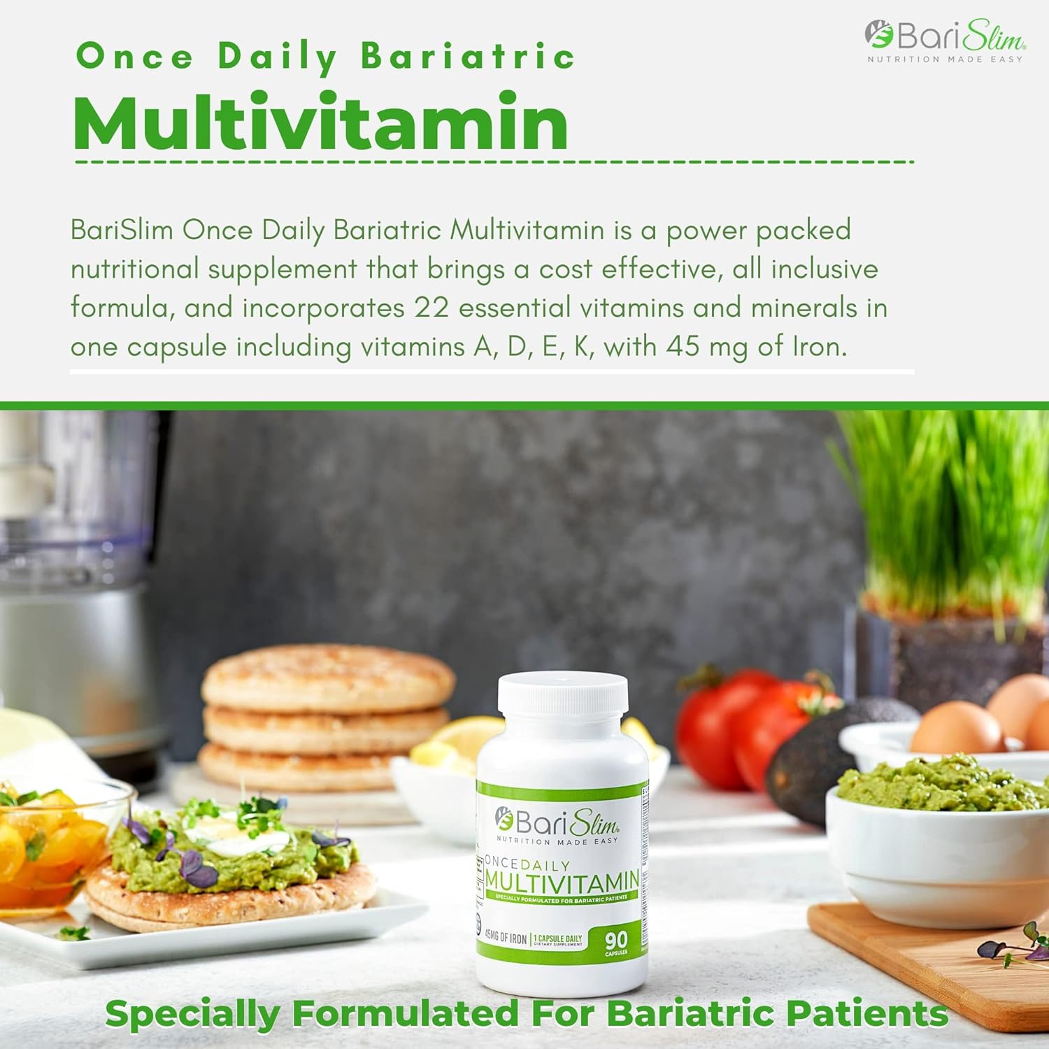 ??Comprehensive Bariatric Support?: BariSlim Once Daily Bariatric Multivitamin Capsules is a complete solution for post-bariatric surgery patients, including those who have undergone gastric bypass and gastric sleeve procedures. Our formula is carefully crafted to provide the essential nutrients you need on your journey to better health. With a convenient daily dose, you can easily incorporate these capsules into your routine??High Iron Formula?: Iron deficiency is a common concern for bariatric patients, but with BariSlim, you get a powerful 45 mg of iron in each serving. This substantial iron supplement content helps combat deficiencies, supporting healthier blood and energy levels. You can trust our multivitamin with iron to provide the iron your body requires??90 Servings in Each Bottle?: We understand the importance of consistency when it comes to your post-bariatric vitamin regimen. That's why we offer a generous 90-day supply in each bottle. No more worrying about running out of your essential vitamins and minerals. This means you won't have to constantly reorder, making your life easier??Once Daily Convenience?: We know that post bariatric surgery, life can get busy. That's why we've designed our bariatric multivitamin capsules to be easy to swallow, so you can stay consistent with your daily regimen. Just one capsule a day is all you need to meet your nutritional requirements. Take the hassle out of managing your vitamins and focus on your health??Trusted Quality?: BariSlim Bariatric Multivitamin is dedicated to your well-being, and we take the quality of our product seriously. Our multivitamin capsules are proudly made in the USA in a GMP-certified facility, ensuring the highest standards of quality and safety. Backed by a 30-day money-back guarantee, you can invest in your health with confidence. Choose BariSlim for a healthier tomorrow