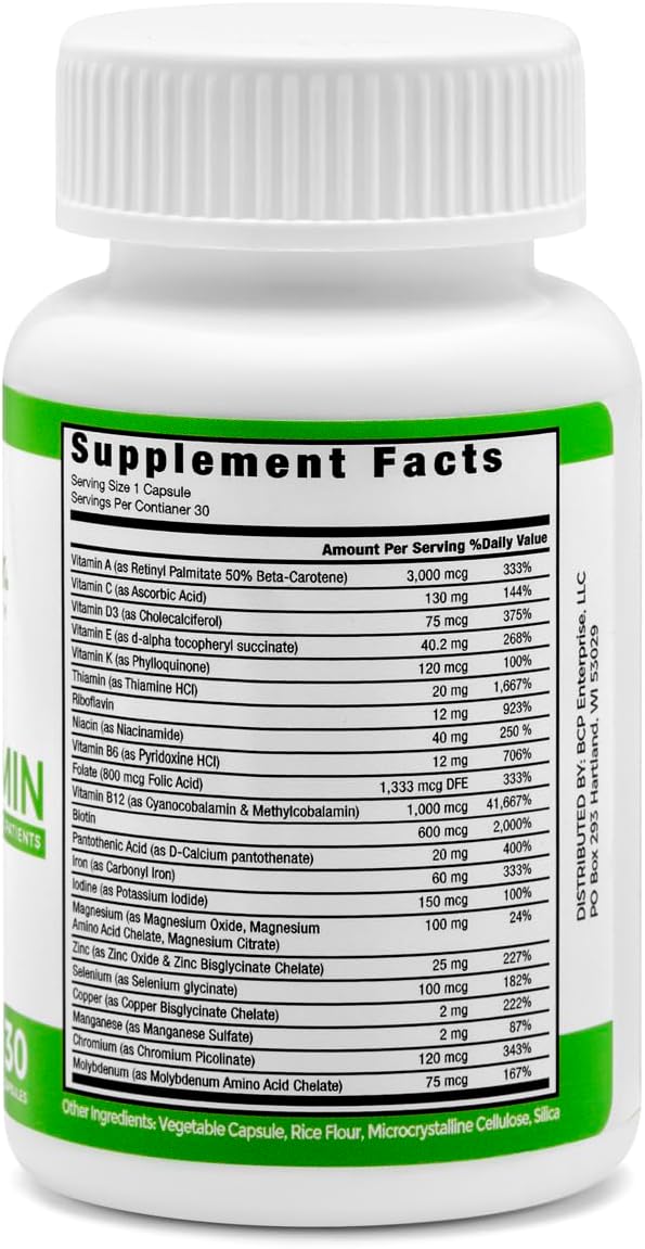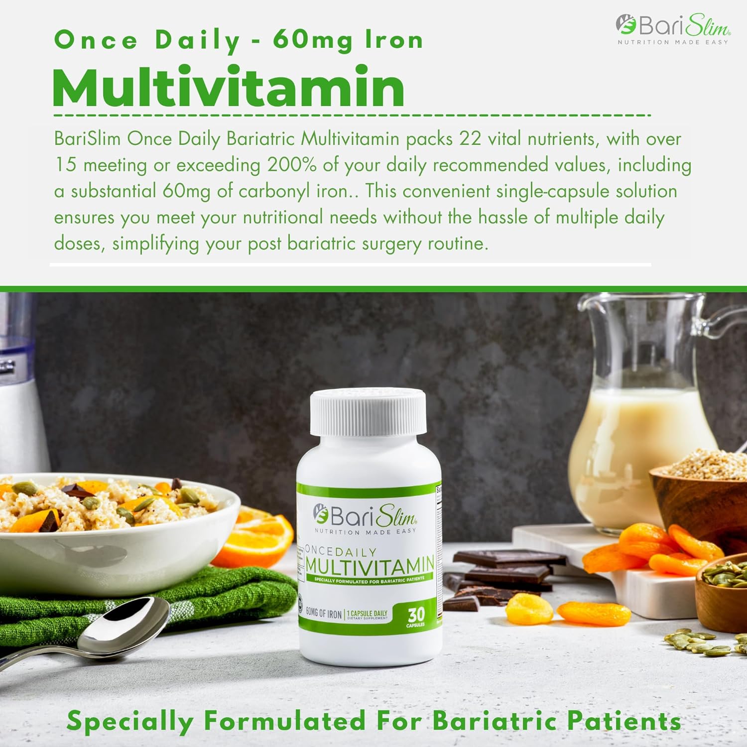 ??Comprehensive Bariatric Support?: BariSlim Once Daily Bariatric Multivitamin packs 22 vital nutrients, with over 15 meeting or exceeding 200% of your daily recommended values, including a substantial 60mg of iron supplement. This convenient single-capsule solution ensures you meet your nutritional needs without the hassle of multiple daily doses, simplifying your post bariatric surgery routine??High Iron Formula?: Iron deficiency is a common concern for bariatric patients, but with BariSlim, you get a powerful 60mg of iron in each serving. This bariatric vitamin formula uses the highly absorbable form of Carbonyl Iron to help combat deficiencies, supporting healthier blood and energy levels. You can trust our multivitamin with iron to provide the iron your body requires??Budget-Friendly Option?: BariSlim offers a 30-day supply per bottle, which translates to substantial savings on your post-weight-loss surgery nutrition needs. We are committed to delivering quality at a reasonable price, aligning with the core principles of affordability, ease of daily use, and great taste in our bariatric multivitamins offerings??ASMBS Guidelines Compliant?: BariSlim's bariatric multivitamin capsules are formulated by the standards set by the American Society for Metabolic and Bariatric Surgery (ASMBS). Tailored for patients post Gastric Bypass, Gastric Sleeve, and Lap Band surgeries, our bariatric vitamins multivitamin are trusted by professionals and designed to support your specific needs during the post-surgery phase??Professional-Grade Assurance?: BariSlim collaborates with doctors and nutritionists to provide highly nutritional bariatric supplements nationwide. All our multivitamin capsules are proudly made in the USA and backed by a 30-day money-back guarantee. Rest assured, you're choosing a brand that's committed to your well-being and your successful post-bariatric surgery journey