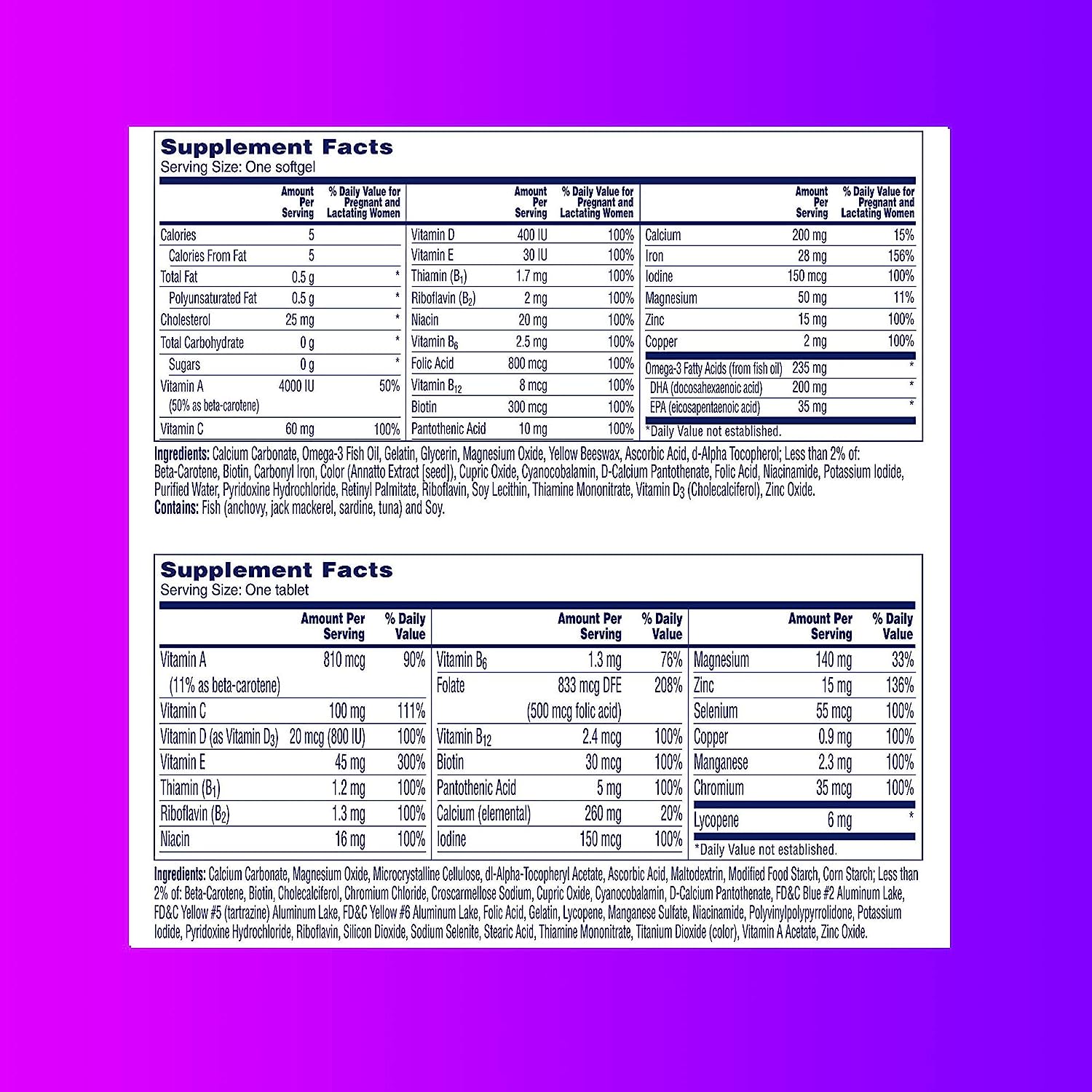 5 > Contains 30 one a day women's prenatal multivitamin softgels and 30 men's pre conception health tablets; Sat. fat less than 20 gram