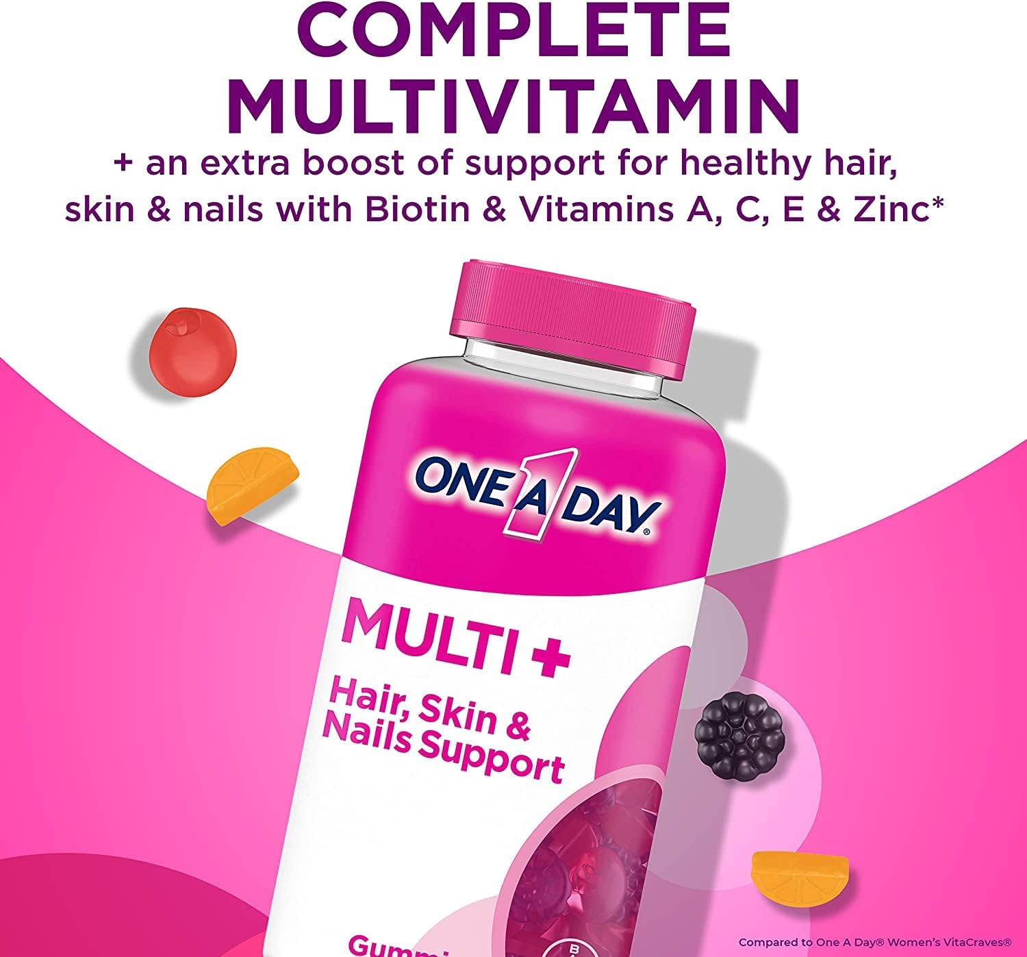 Introducing One A Day Multi+ Hair, Skin & Nails Support: A Complete Gummy Multivitamin + A Boost Of Support For Healthy Hair, Skin & Nails. This Delicious Gummy Multivitamin Combines 12 Essential Vitamins And Minerals For Daily Nutritional Support Including Biotin And Vitamins A, C, E & Zinc To Boost Support For Your Hair, Skin, & Nails. Free Of: Artificial Sweeteners, High Fructose Corn Syrup
