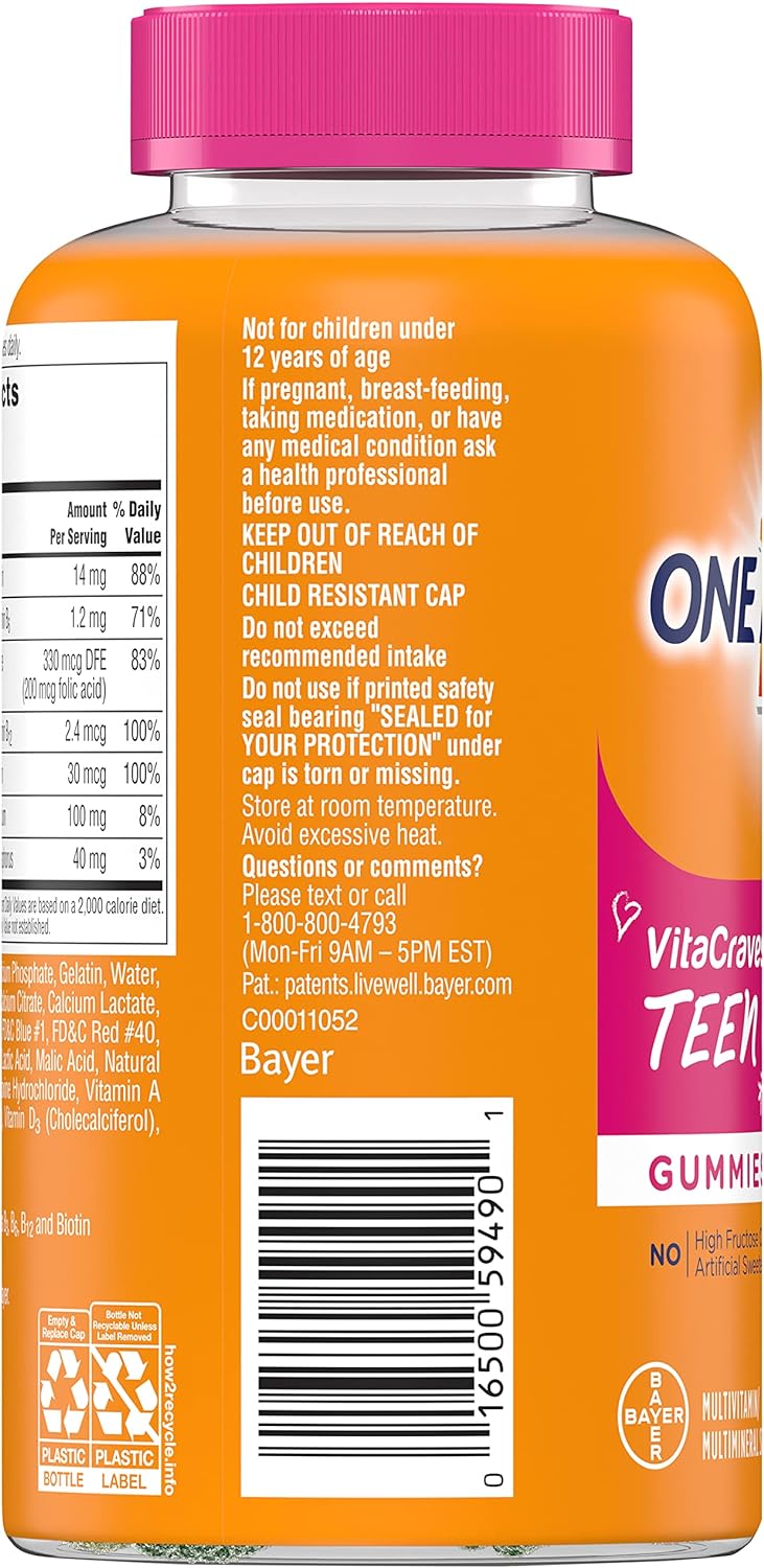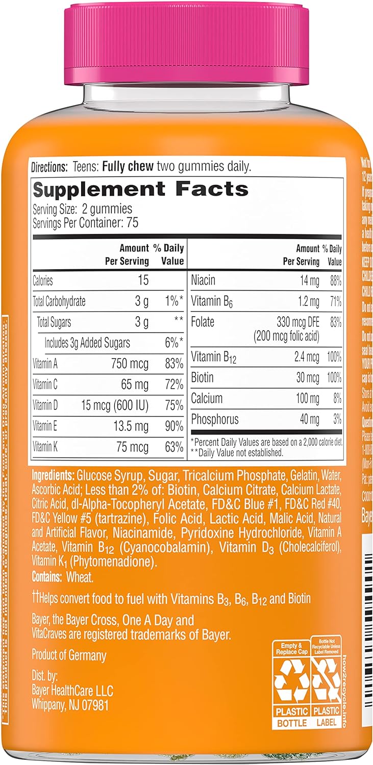 One A Day For Her Teen Multivitamin Gummies Offer A Wide Variety Of Key Vitamins And Minerals. This Easy To Take Gummy Contains Nutrients Specially Selected To Support The Overall Health Of Teenage Girls. This Daily Multivitamin Contains Vitamins A, B6, B12, C, D, E, And K, Niacin, Folic Acid, Biotin, And Calcium. One A Day For Her Teen Multivitamin Gummies Are Formulated To Support Bone Health, Immune Health, And Physical Energy By Helping Convert Food To Fuel.* Teenage Girls Should Fully Chew Two Gummies Daily. One A Day Multivitamins Can Provide Nutritional Support That You And Your Family May Need At Every Life Stage. *This Statement Has Not Been Evaluated By The Food And Drug Administration. This Product Is Not Intended To Diagnose, Treat, Cure, Or Prevent Any Disease