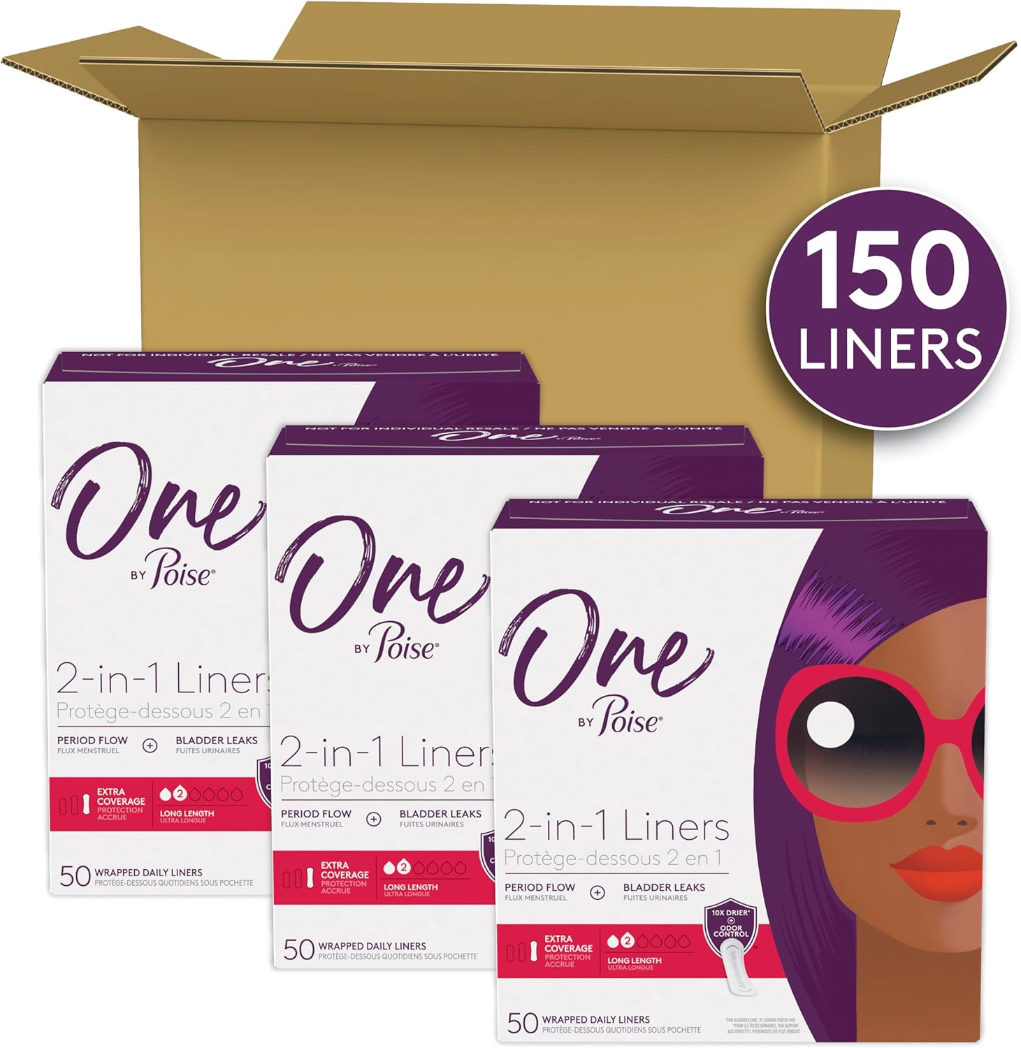One By Poise Panty Liners (2-In-1 Period & Bladder Leakage Daily Liner), Long, Extra Coverage For Period Flow, Very Light Absorbency For Bladder Leaks, 150 Count (3 Pack Of 50)
