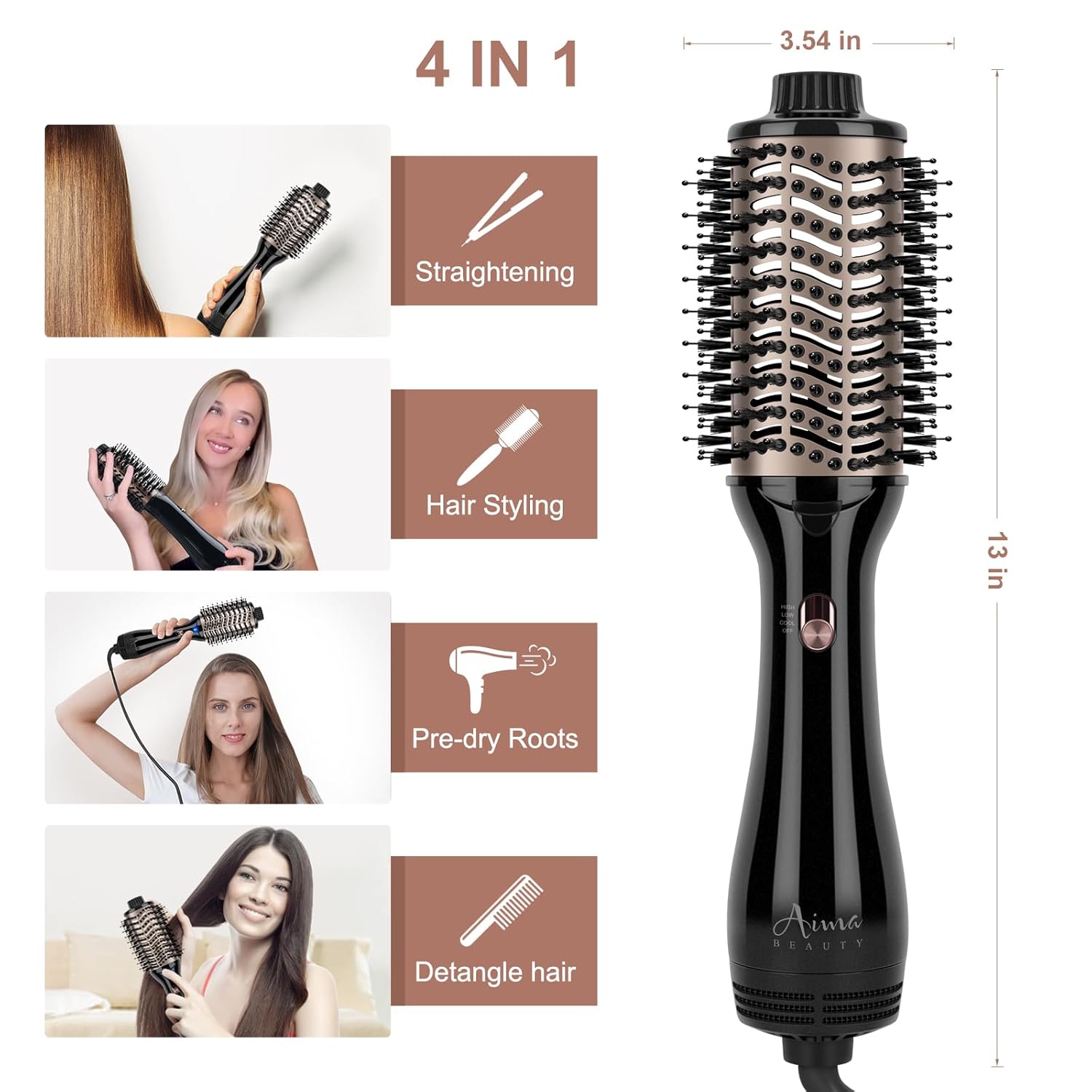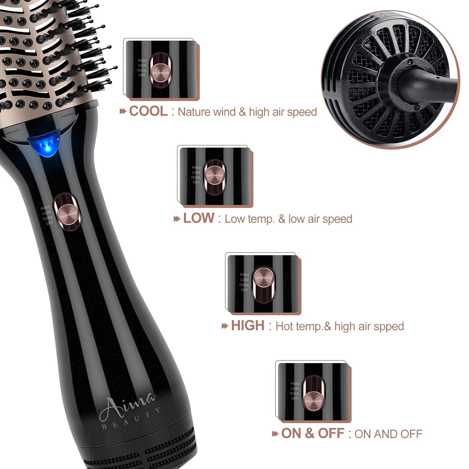 About this item Negative Ionic Technology: One step hair dryer brush with 360° release of negative ions design and ceramic coating can saturate the airflow, can increase the moisture of your hair. This helps condition and make hair shinier while reducing frizz and static, and preventing the hair from splitting. Perfect for dry and wet hair all hair types. Professional 4 In 1 Function: In addition to hairdryer and curler brush, our oval brush hair dryer also straightener and brush. Suitable for all ages and hair types, like long hair, curls. Besides, one step hair dryer & styler is designed with Nylon Pin & Tufted Bristles for easy detangle & better grip of your hair. The ergonomic handle is designed for maximum comfort and ease of use during styling. 2 Speed & 3 Temperature Settings: 1100 Watt power delivers, 3 adjustable heat levels for different hair types, high heat for thick hair, low heat for fine hair, flexible setting to lock in your beautiful hairstyle.Rotary button design," Cool"-- nature temp.and high speed;""Low""-- medium temperature and low speed;""HIGH""-- high temperature and high speed. Ergonomic Design: Anti-sclading tips brush keeps hair from getting tangles and the oval edges help add volume to hair. It will help you make hair light, anti-tangle, bringing silky shine and texture with just one hand operation. Drying hair on your own easily at any angle with the 360° 6FT swivel power cord, the cord doesn't get all twisted up. 100% Satisfactory and Lifetime Service: The Aima Beauty One Step Hair Dryer and Volumizer meets U.S. safety requirements and proudly features the ETL Certification seal (look for the ‘test’ button on the plug which is required for all hair dryers in the U.S.). We promise all our customers a 365-Day Money-Back Service and 12 Months Replacement, as for the customer service, just feel free to contact us as we are 24h*7d online. You can use it with confidence! See more product details,Negative Ionic Technology: One step hair dryer brush with 360° release of negative ions design and ceramic coating can saturate the airflow, can increase the moisture of your hair. This helps condition and make hair shinier while reducing frizz and static, and preventing the hair from splitting. Perfect for dry and wet hair all hair types,Professional 4 In 1 Function: In addition to hairdryer and curler brush, our oval brush hair dryer also straightener and brush. Suitable for all ages and hair types, like long hair, curls. Besides, one step hair dryer & styler is designed with Nylon Pin & Tufted Bristles for easy detangle & better grip of your hair. The ergonomic handle is designed for maximum comfort and ease of use during styling,2 Speed & 3 Temperature Settings: 1100 Watt power delivers, 3 adjustable heat levels for different hair types, high heat for thick hair, low heat for fine hair, flexible setting to lock in your beautiful hairstyle.Rotary button design," Cool"-- nature temp.and high speed;""Low""-- medium temperature and low speed;""HIGH""-- high temperature and high speed,Ergonomic Design: Anti-sclading tips brush keeps hair from getting tangles and the oval edges help add volume to hair. It will help you make hair light, anti-tangle, bringing silky shine and texture with just one hand operation. Drying hair on your own easily at any angle with the 360° 6FT swivel power cord, the cord doesn't get all twisted up,100% Satisfactory and Lifetime Service: The Aima Beauty One Step Hair Dryer and Volumizer meets U.S. safety requirements and proudly features the ETL Certification seal (look for the ‘test’ button on the plug which is required for all hair dryers in the U.S.). We promise all our customers a 365-Day Money-Back Service and 12 Months Replacement, as for the customer service, just feel free to contact us as we are 24h*7d online. You can use it with confidence!