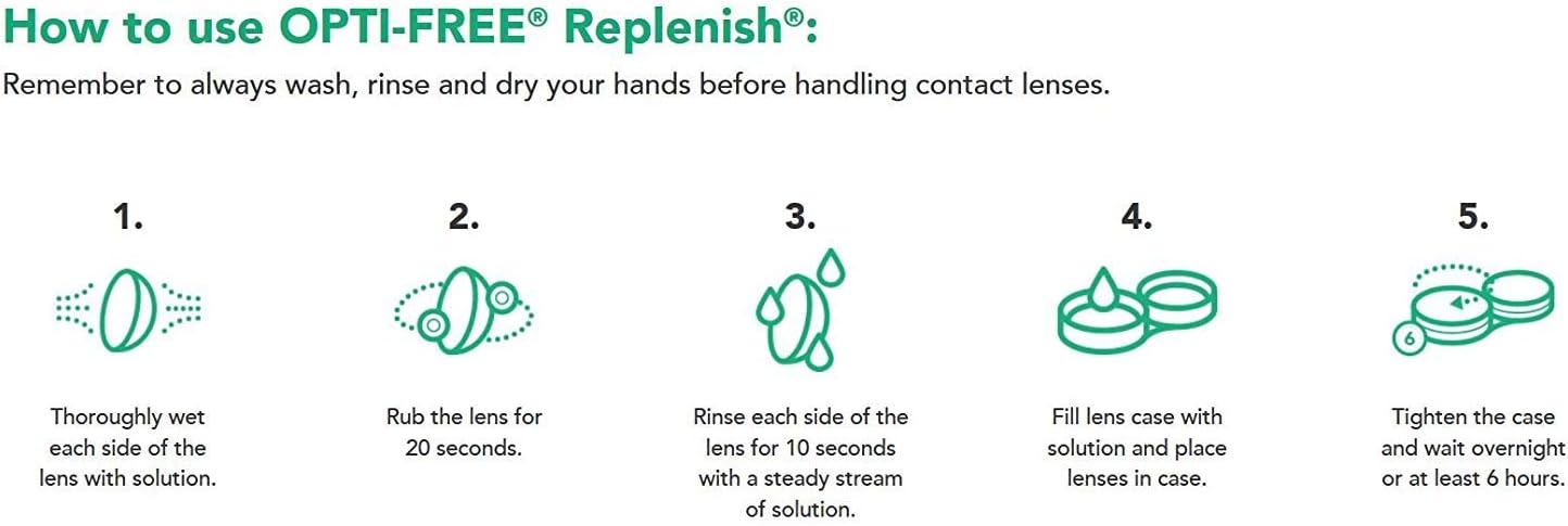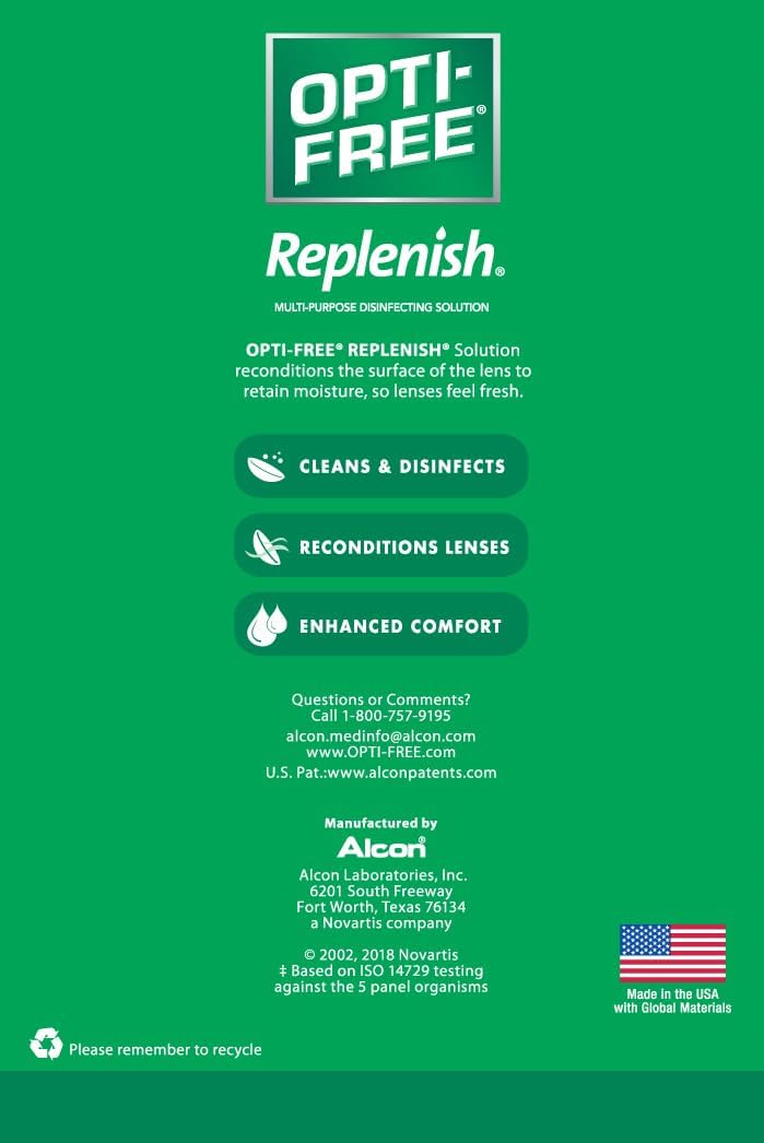 Opti-Free Replenish Multi-Purpose Disinfecting Solution Is A Powerful Contact Lens Solution That Is Designed For Optimal Daily Cleaning. Opti-Free Replenish Solution Features Polyquad And Aldox Helps Disinfect And With Top-Notch Cleaning Power, And Provides Long Lasting Moisture And Comfort For All Day Use. The Exclusive 2D Formula Contains And Washes Away Irratants That Could Result In Eye Infections And Irritation. The Tearglyde Reconditioning System That Works With Tears To Help Create A Barrier Of Comfortable Moisture And Constant Comfort. The Tearglyde Reconditioning System Applies Itself To The Lens Allowing A Thin Layer Of Moisture From The Patient’S Natural Tears To Remain On The Lens, Allowing For A Continuous Shield Of Moisture To Form Between The Lens And The Eye. Opti-Free Replenish Solution Will Help To Remove Unwanted Debris And Particles, Keeping Contact Lenses Cleaner And Clearer. Opti-Free Replenish Solution Works With Silicon Hydrogel And Soft Contact Lenses. For The Best Results, Rinse And Rub Each Side Of The Lens With Solution For 20 Seconds. Afterwards, Rinse Each Side Of The Lens With A Steady Stream Of Solution For 10 Seconds. Then Place The Contact Lens In The Case With The Solution For At Least 6 Hours Or Overnight. These Lenses May Be Left In The Solution And In An Unopened Case For Up To 30 Days Before Having To Clean And Disinfect Again. Opti-Free Strives To Continue Providing Patients With The Newest And Most Effective Contact Lens Products On The Market For Dry And Irritated Eyes