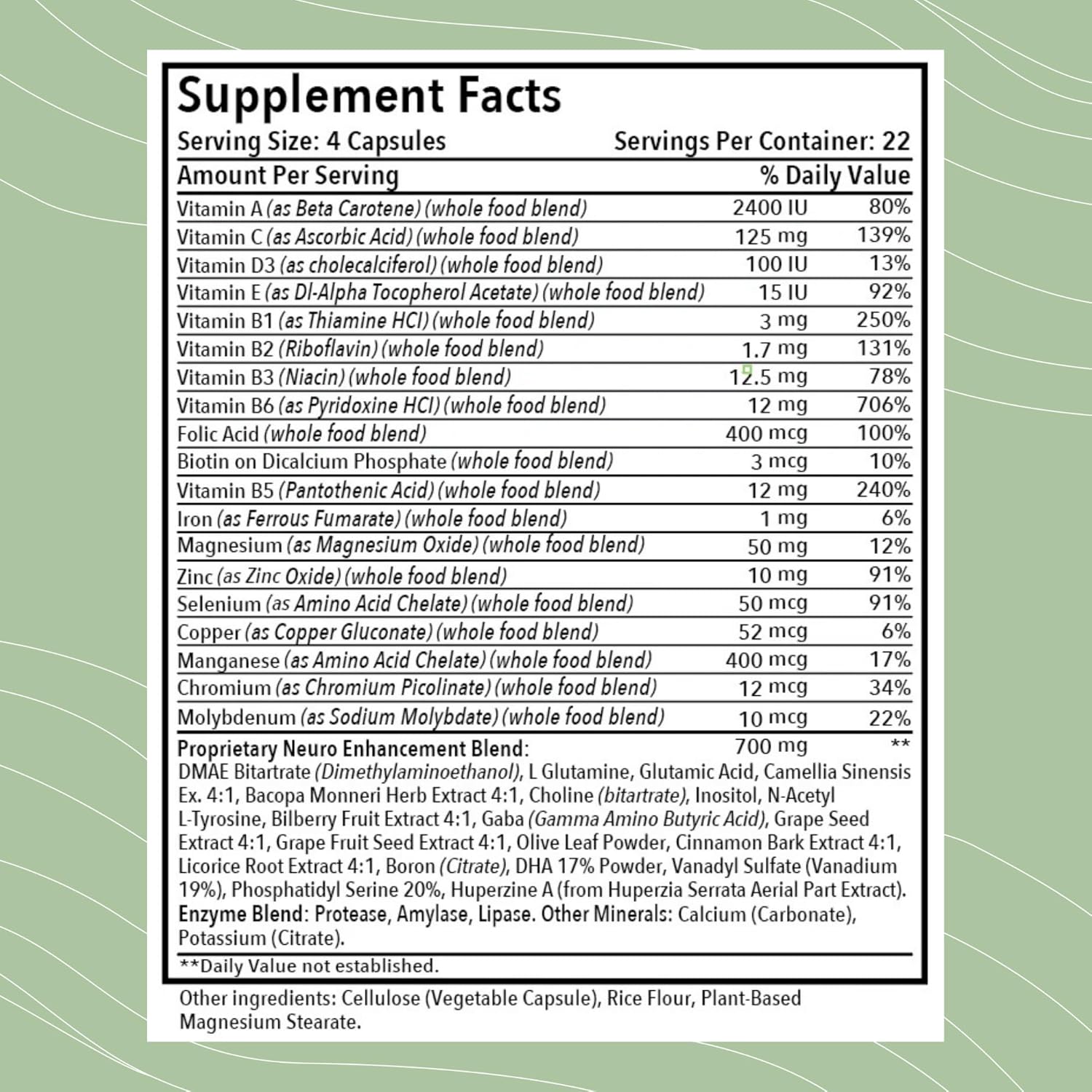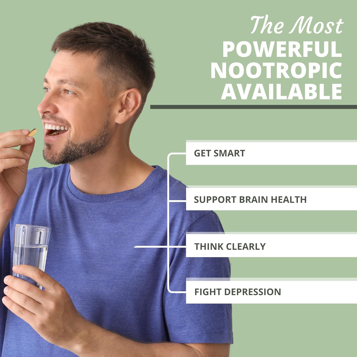 About this item Most Powerful Nootropic Blend » Designed to enhance mental clarity, focus, and alertness, providing essential nutrients to support cognitive function and brain health. Boosts Memory & Intelligence » Supports neuroplasticity, learning, and information retention, helping you stay sharp and focused throughout the day. Enhances Mood & Reduces Stress » Contains Bacopa Herb, L-Theanine, and L-Tyrosine, which help support regulated dopamine and serotonin. Supports Brain Health & Longevity » Provides omega-3 fatty acids, flavonoids, and vitamin E to protect against oxidative stress, cognitive decline, and age-related memory issues. Increases Energy & Mental Stamina » Combats mental fatigue by fueling neurotransmitters like acetylcholine, improving mental endurance and clarity. Premium Whole Food Formula » Made with non-GMO, gluten-free, dairy-free ingredients, including Huperzine A, Choline, and DMAE for maximum nootropic support. See more product details,Most Powerful Nootropic Blend » Designed to enhance mental clarity, focus, and alertness, providing essential nutrients to support cognitive function and brain health,Boosts Memory & Intelligence » Supports neuroplasticity, learning, and information retention, helping you stay sharp and focused throughout the day,Enhances Mood & Reduces Stress » Contains Bacopa Herb, L-Theanine, and L-Tyrosine, which help support regulated dopamine and serotonin,Supports Brain Health & Longevity » Provides omega-3 fatty acids, flavonoids, and vitamin E to protect against oxidative stress, cognitive decline, and age-related memory issues,Increases Energy & Mental Stamina » Combats mental fatigue by fueling neurotransmitters like acetylcholine, improving mental endurance and clarity,Premium Whole Food Formula » Made with non-GMO, gluten-free, dairy-free ingredients, including Huperzine A, Choline, and DMAE for maximum nootropic support