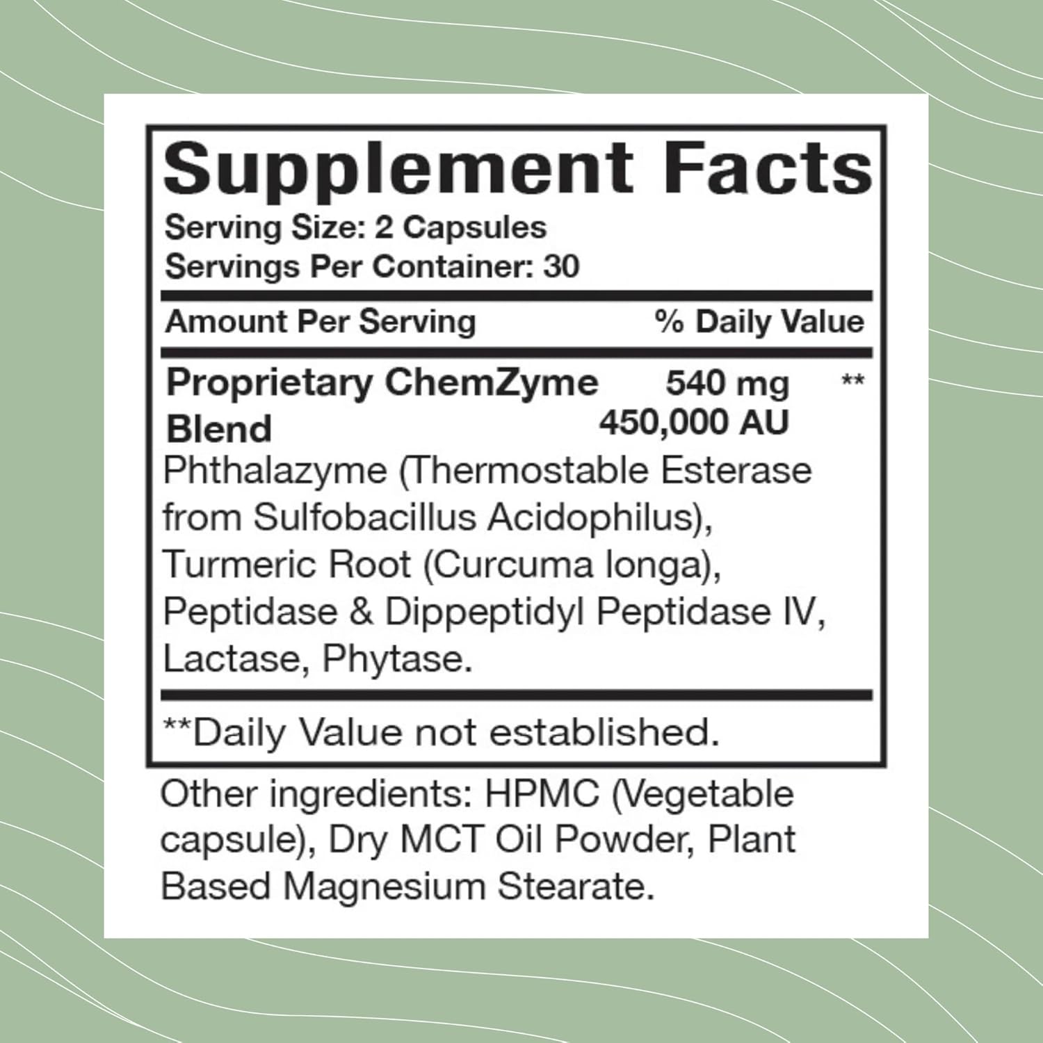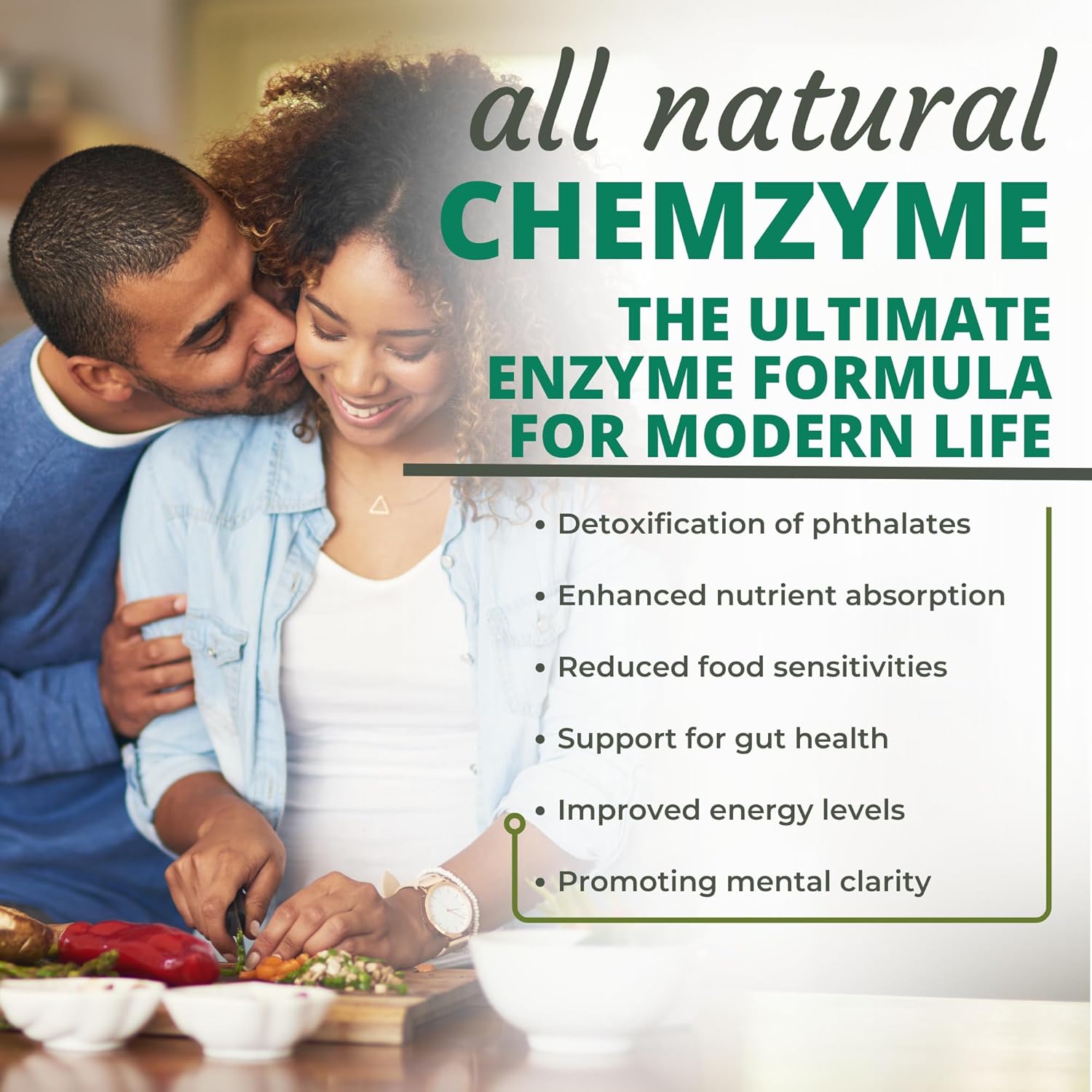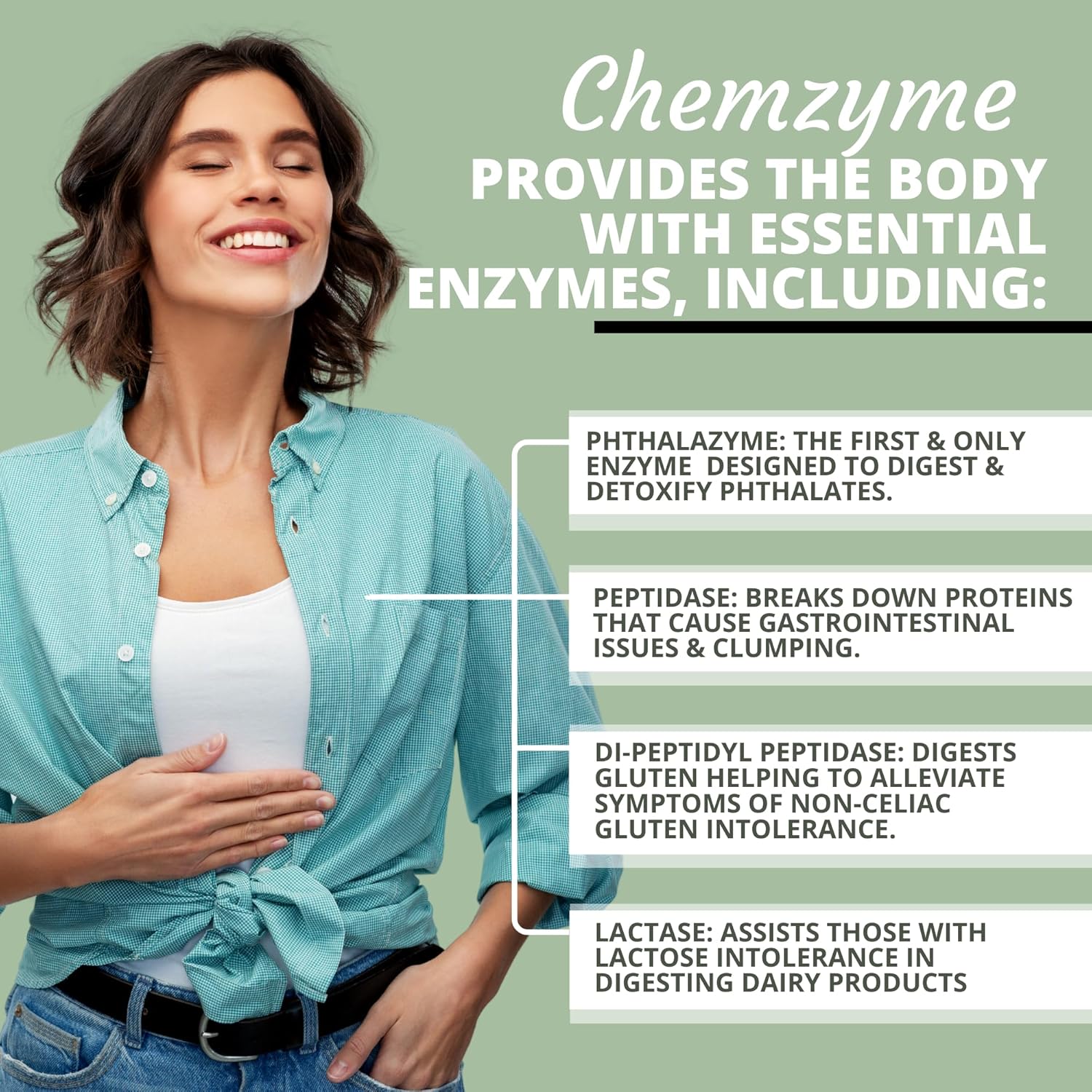 About this item Detoxify Phthalates & Harmful Chemicals » Chemzyme features Phthalazyme, the first and only enzyme specifically designed to detoxify phthalates, a chemical commonly found in food, water, and cosmetics linked to hormonal disruption and behavioral issues. Supports Enhanced Nutrient Absorption » With a potent blend of enzymes like Peptidase and Di-Peptidyl Peptidase, Chemzyme aids in breaking down proteins, gluten, and other food components, improving digestion and nutrient absorption for better overall health. Promotes Gut Health & Reduces Food Sensitivities » This enzyme formula supports a healthy gut by helping digest proteins and gluten, reducing the discomfort associated with food sensitivities, such as lactose intolerance and gluten sensitivity. Boosts Energy & Mental Clarity » Regular use of Chemzyme helps clear the body of harmful toxins, promoting enhanced energy levels, mental clarity, and improved overall well-being. Convenient Daily Dose » Take 2 capsules daily on an empty stomach—1 mid-morning and 1 in the afternoon—to support daily detoxification and optimal digestive function. See more product details,Detoxify Phthalates & Harmful Chemicals » Chemzyme features Phthalazyme, the first and only enzyme specifically designed to detoxify phthalates, a chemical commonly found in food, water, and cosmetics linked to hormonal disruption and behavioral issues,Supports Enhanced Nutrient Absorption » With a potent blend of enzymes like Peptidase and Di-Peptidyl Peptidase, Chemzyme aids in breaking down proteins, gluten, and other food components, improving digestion and nutrient absorption for better overall health,Promotes Gut Health & Reduces Food Sensitivities » This enzyme formula supports a healthy gut by helping digest proteins and gluten, reducing the discomfort associated with food sensitivities, such as lactose intolerance and gluten sensitivity,Boosts Energy & Mental Clarity » Regular use of Chemzyme helps clear the body of harmful toxins, promoting enhanced energy levels, mental clarity, and improved overall well-being,Convenient Daily Dose » Take 2 capsules daily on an empty stomach—1 mid-morning and 1 in the afternoon—to support daily detoxification and optimal digestive function