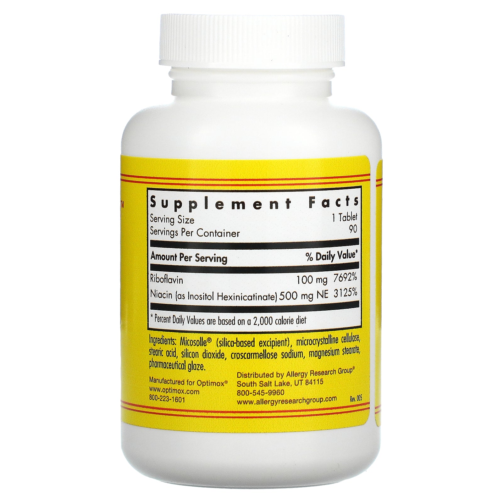 A specially formulated high potency vitamins B-2/B-3 combination, containing 100 mg of Riboflavin and 500 mg of Niacin (as inositol hexanicotinate) per tablet.