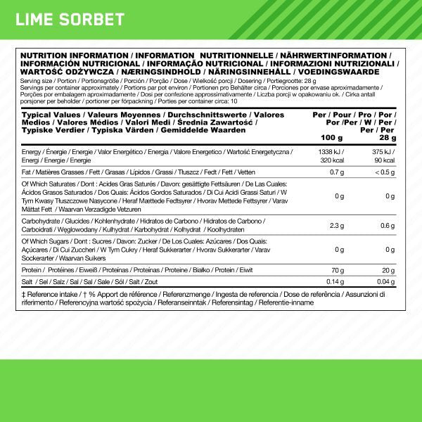 Product Information:Optimum Nutrition Are Delighted To Launch Our New Clear Protein Formula, In Our Light And Refreshing Lime Sorbet Flavour. This 100% Plant Protein Isolate Contains 20 G High Quality Protein Per Serving To Support Muscle Growth And Repair*. Each Great Tasting Serving Also Contains 3.6 G Of Naturally Occurring Bcaas, Zero Sugar And Is Vegan Society Approved. A Refreshing Option, Without The Milky Texture If You Are Looking For A Whey Alternative. Clear Protein Is Best Enjoyed First Thing In The Morning And/Or During The 30 Minutes Just Before Or Immediately After Training. *Protein Contributes To Muscle Growth And Muscle Maintenance, When Used In Conjuction With Weight Resistance Training.To Be Used In The Framework Of A Varied And Balanced Diet And A Healthy Lifestyle,Product Specification:Hydrolysed Pea Protein Isolate, Acid (Citric Acid), Natural Flavouring, Anti-Caking Agent (Silicon Dioxide), Sweeteners (Sucralose, Steviol Glycosides From Stevia), Curcuma Oil Extract, Spirulina Powder