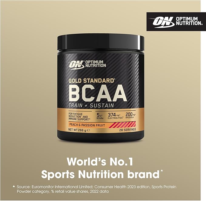 Optimum Nutrition Gold Standard Bcaa Train + Sustain, Amino Acids Pre Workout Powder, Sports Drink With Vitamin C, Zinc, Magnesium And Electrolytes, Peach & Passionfruit Flavour, 28 Servings, 266 G