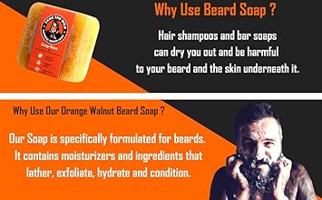 mens beard soap pack of 1,Great Smelling Natural Soap: Our natural soap's clean, refreshing, fresh, but not overpowering orange citrus scent will neutralize odors and make your beard smell amazing,Goodbye Dry, Itchy Beard: Our beard wash and conditioner for men helps get rid of dry patches and beard dandruff. With shea butter and coconut oil, our beard wash will help moisturize and hydrate your beard and the skin underneath it,Exfoliates And Promotes Growth: The strong lather and walnut granules in our men's soap clear the pores of dirt, oil, and dead skin, increasing blood circulation and beard growth. Your face and body will feel clean after using our beard soap,Enhance your beard: Our beard wash was created to promote healthy beard growth by both cleaning, hydrating, and softening your beard. Packed in a perfect box our premium beard wash makes a perfect Fathers Day Gift or gift for guys with beards