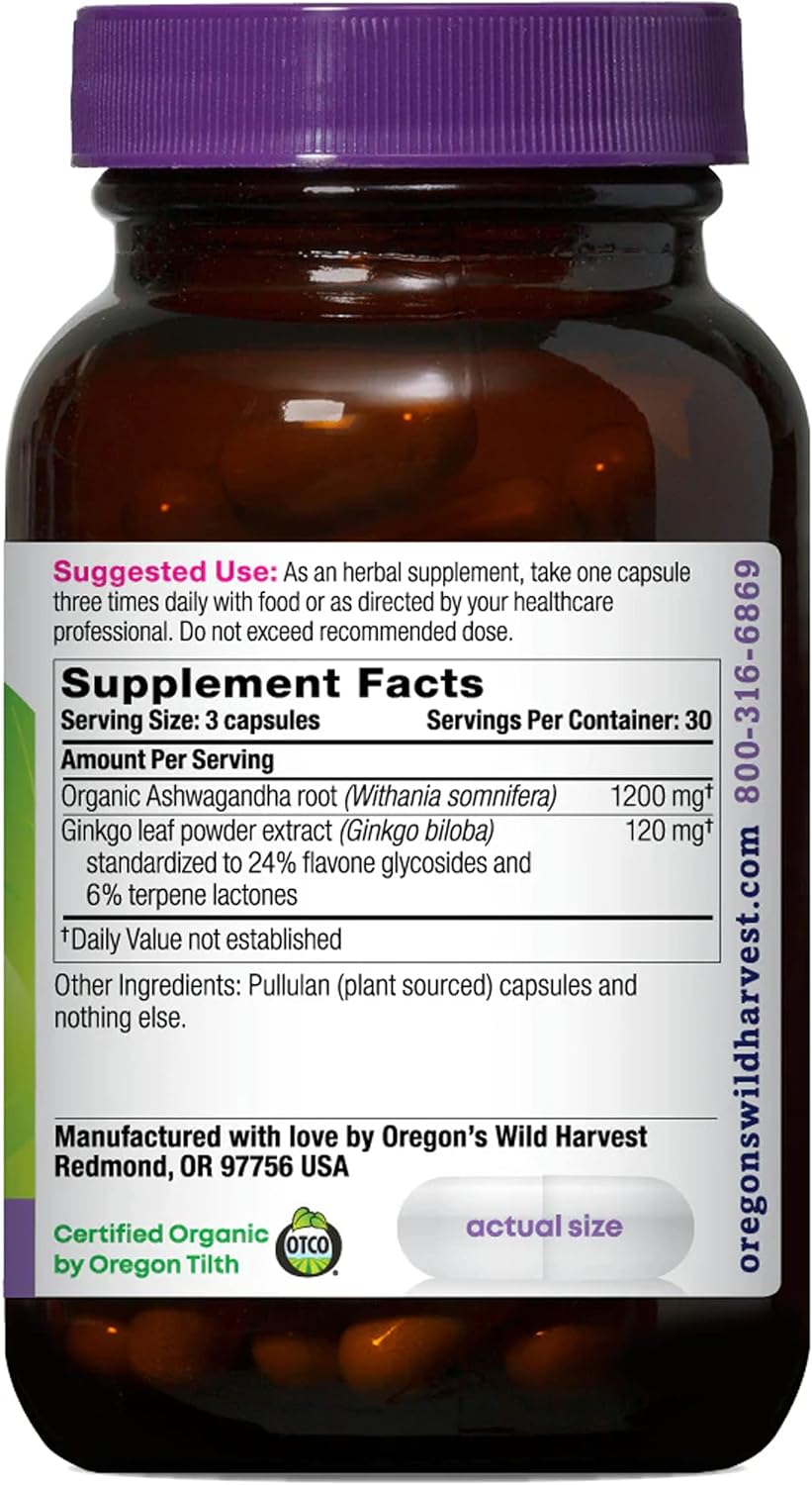 DESCRIPTION : Oregon's Wild Harvest Ashwagandha Ginkgo Organic Non-GMO Herbal Supplements Vegan Plant sourced Capsules | Support for Calm and Relaxed Mind, 90Count