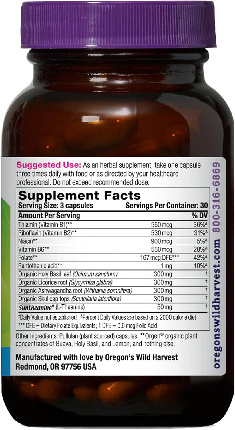 Oregon's Wild Harvest mental Guard Capsules. Combining a proprietary blend of whole, organic herbs, and beneficial vitamins, mental Guard⢠is designed to help your body adapt naturally. Comprised of Vitamin B1, B2, B3, Vitamin B5, Vitamin B6, Folate, Organic Holy Basil leaf (Ocimum sanctum), Organic Licorice root (Glycyrrhiza glabra), Organic Ashwagandha root (Withania somnifera), Organic Skullcap tops (Scutellaria lateriflora), and Suntheanine (L-Theanine), mental Guard⢠can support your adrenal glands, reducing adrenal depletion, promoting sleep, relaxation, and reduced. Manufactured in Redmond, OR, Oregon's Wild Harvest was proudly founded in 1994 by a registered surgical nurse and farmer with a desire to create natural herbal supplements that give back to the earth through healthy soil, clean water, and the saving of our Non-GMO seeds. Contained in natural bovine gelatin capsules and free of artificial flavors, colors, excipients, or stearates, Oregon's Wild Harvest mental Guard⢠capsules are also gluten-free and dairy-free, and soy-free, and have been product verified Non-GMO by SGS, an independent third-party lab. As an herbal supplement, take three capsules daily with food, or as directed by your health care professional. Do not take if sensitive to peanuts or chickpeas. Keep out of reach of children. Do not take if pregnant or nursing