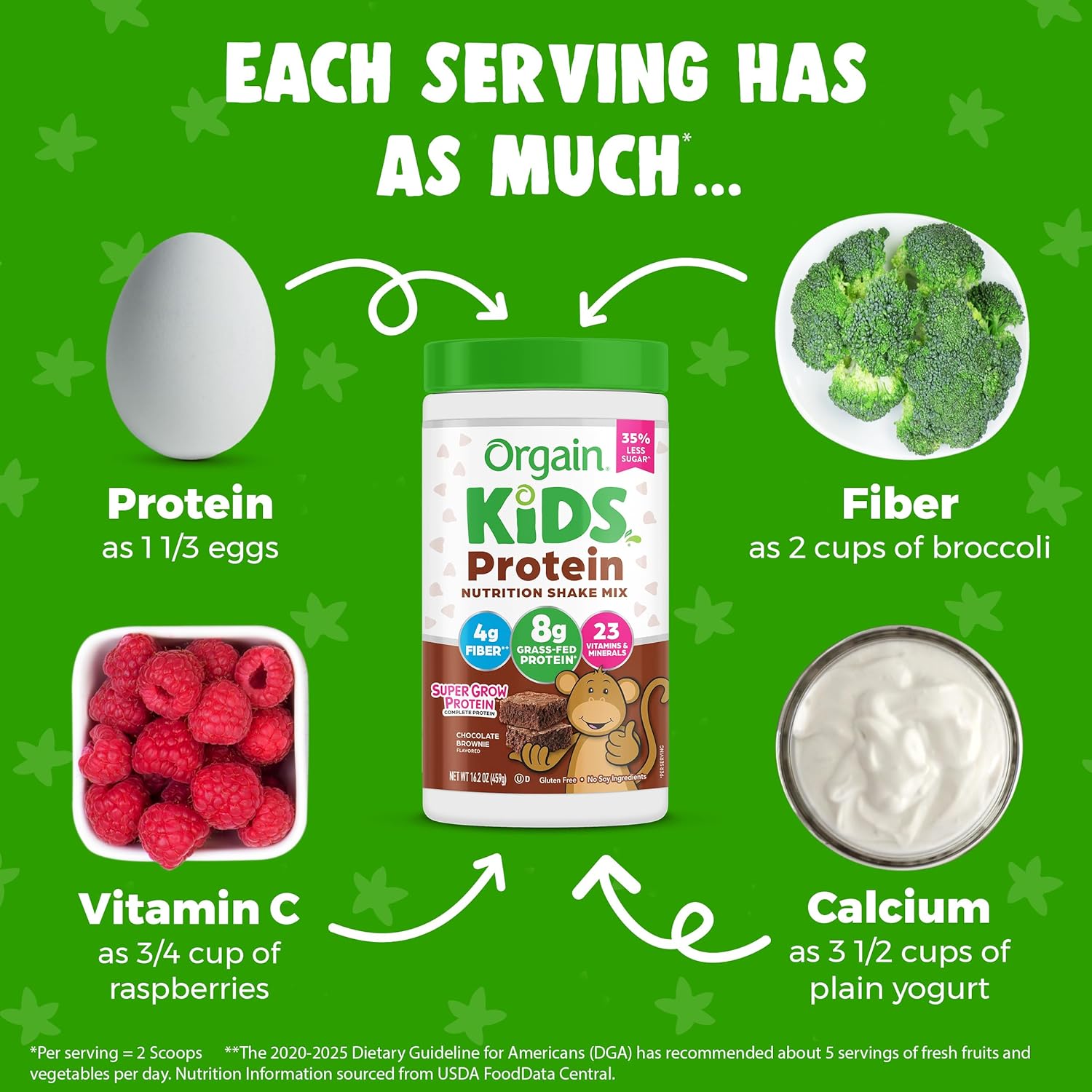 BULLET POINTS : 1 > Includes 1 (16.2 ounce) Orgain Kids Protein Nutrition Shake Mix, Chocolate Brownie. 8g SuperGrow grass-fed dairy protein, 4 grams dietary fiber, 23 vitamins & minerals, blend of 10 fruits and vegetables, 180 calories per serving